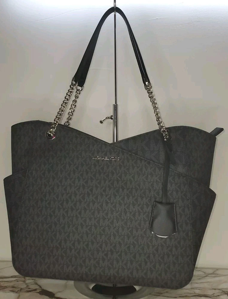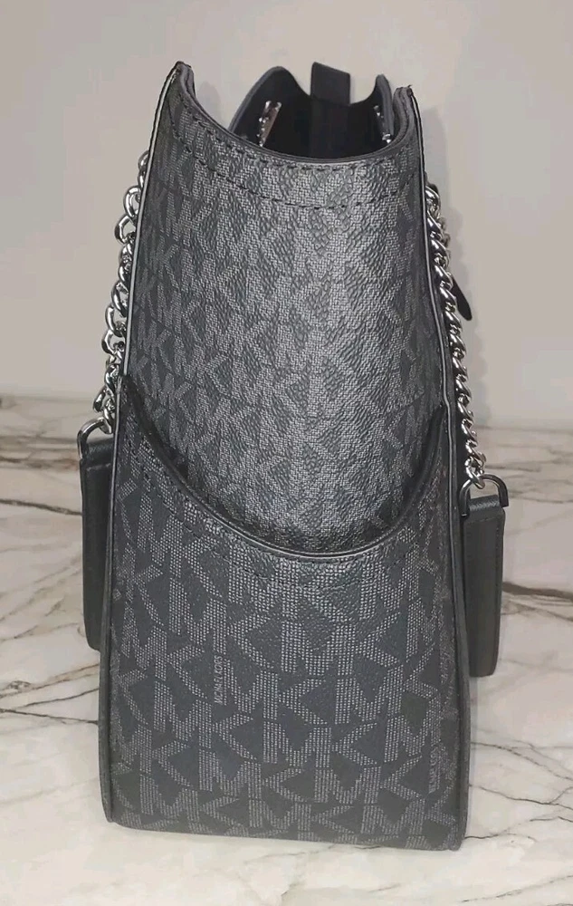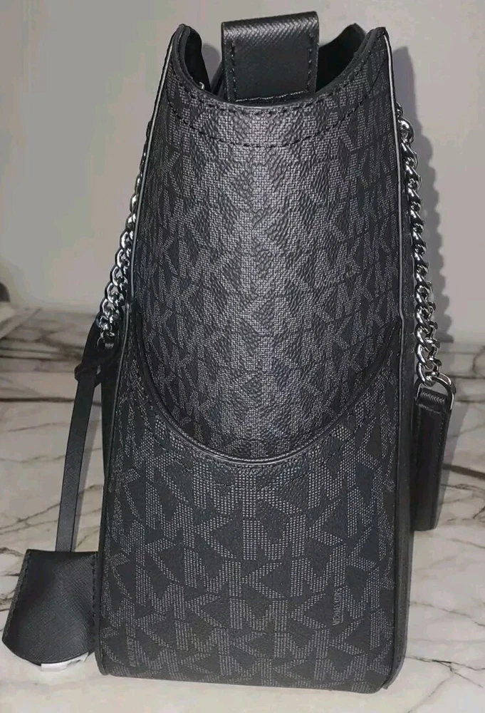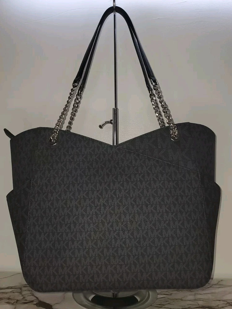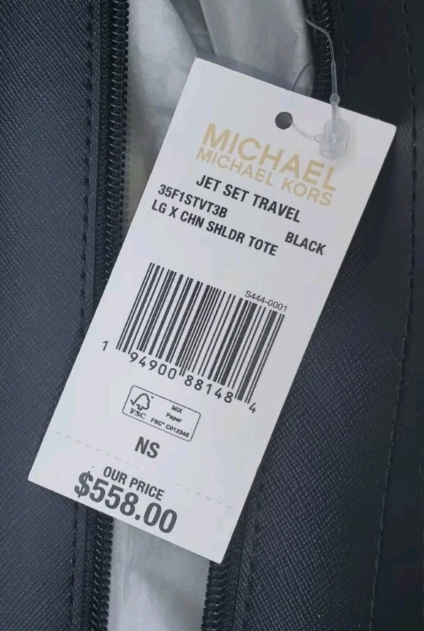 Complement your travel attire with this stylish Michael Kors Jet Set Travel tote. The tote has enough space to accommodate all the essentials you need for your journey. It features a beautiful black exterior made of high-quality PVC with a chain shoulder strap that adds a touch of class to your outfit. The tote also comes with tags indicating its authenticity, making it a perfect addition to your collection. The tote is designed for women and is part of the Michael Kors Jet Set Travel product line. It is perfect for any occasion and will make you stand out in the crowd.