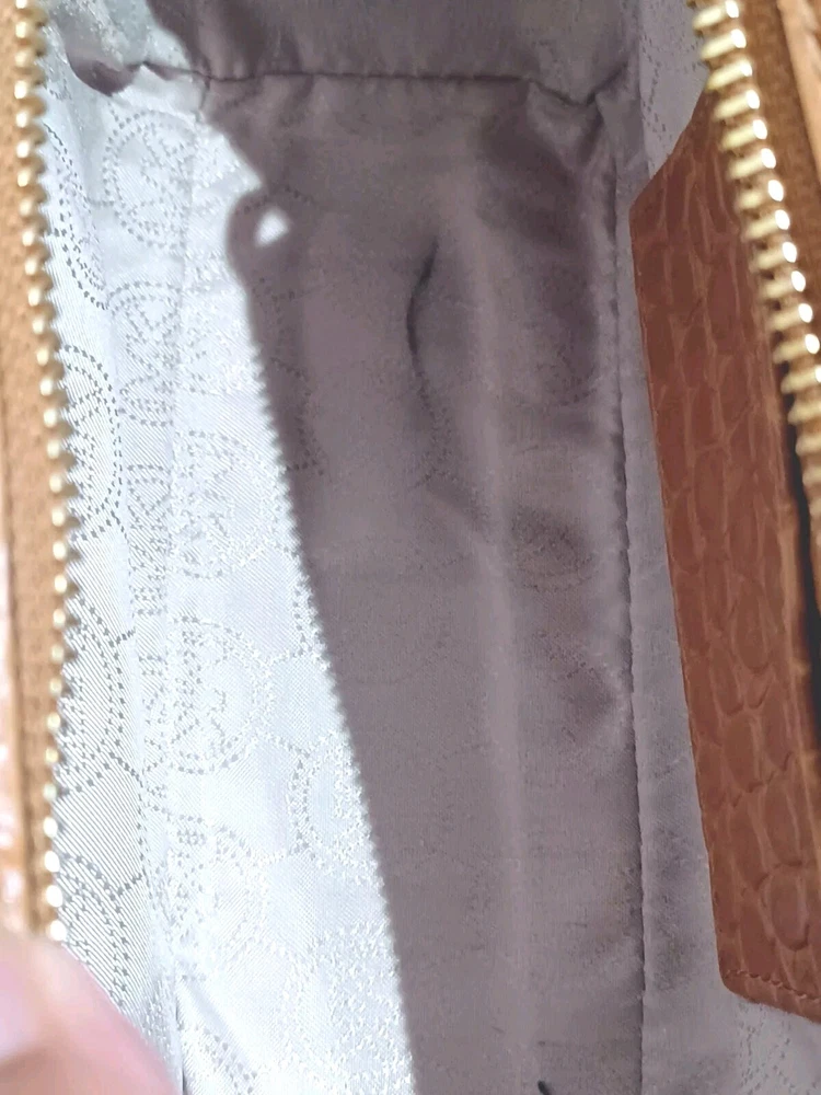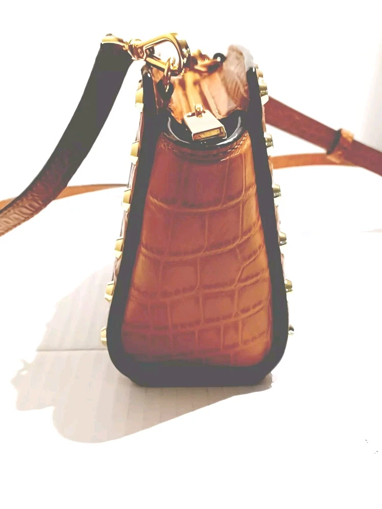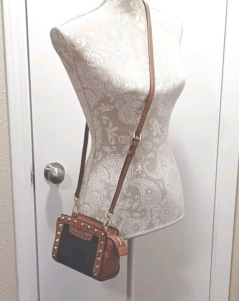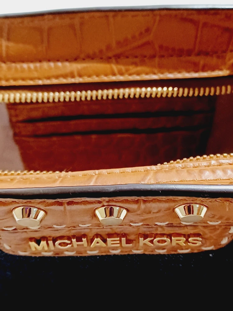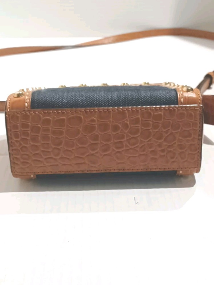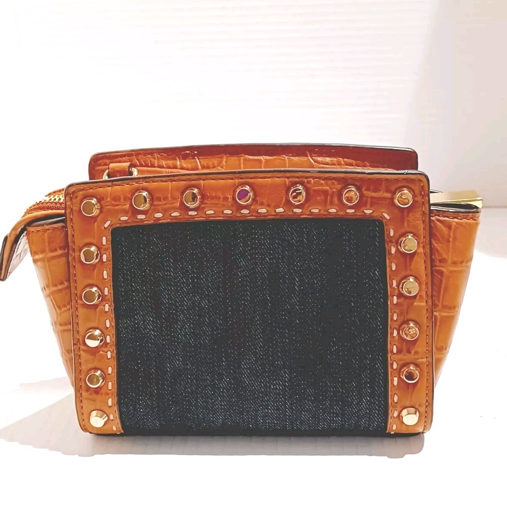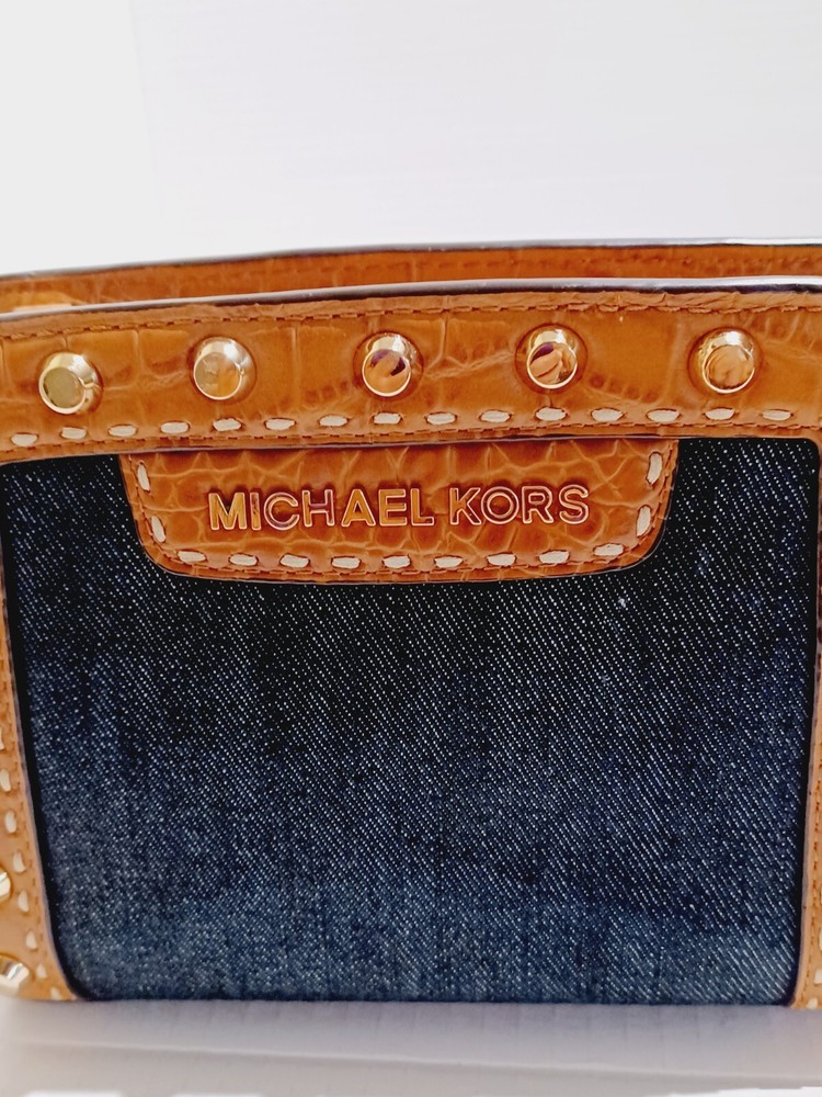 This Michael Kohrs Selma Mini Camel Embossed Leather Denim Crossbody Bag is a stylish and versatile addition to any wardrobe. With a zip closure and studded accents, this bag is perfect for a night out or a day of running errands. The crossbody strap is adjustable and the bag has a depth of 3 inches, making it easy to carry around. The exterior is made of camel color leather with a blue denim colorblock pattern, and the bag is lined. It comes with a detachable strap and handle keeper, making it easy to switch between crossbody and over-the-shoulder modes. This designer bag is a must-have for any fashion-conscious woman. Comes with a certificate of authenticity. Bag is in great condition but has a ink spot on lining (see photo)