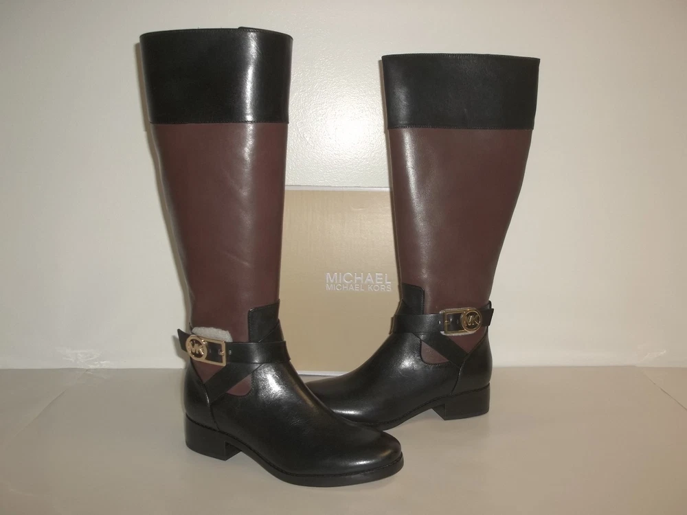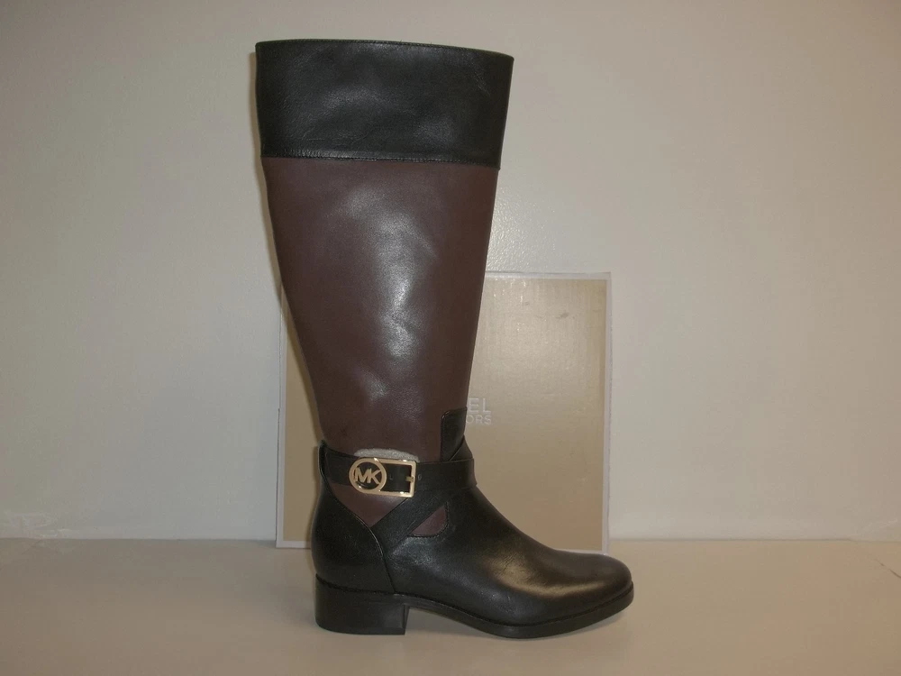 Michael Kors Size 5.5 M BRYCE TALL Black Mocha Leather Boots New Womens Shoes -Style: 40F5BYMB8L -Color: Blk/Mocha -Leather upper -Leather and textile lining -Leather insole -Man made outsole -Heel height is approximately 1.25 inches -Shaft height is approximately 14.75 inches -Top to bottom is approximately 16 inches -Boot opening measures approximately 15 inches and flexible -Emblem and zipper are gold color