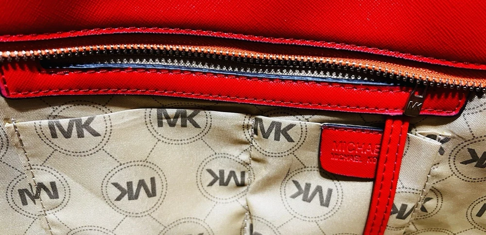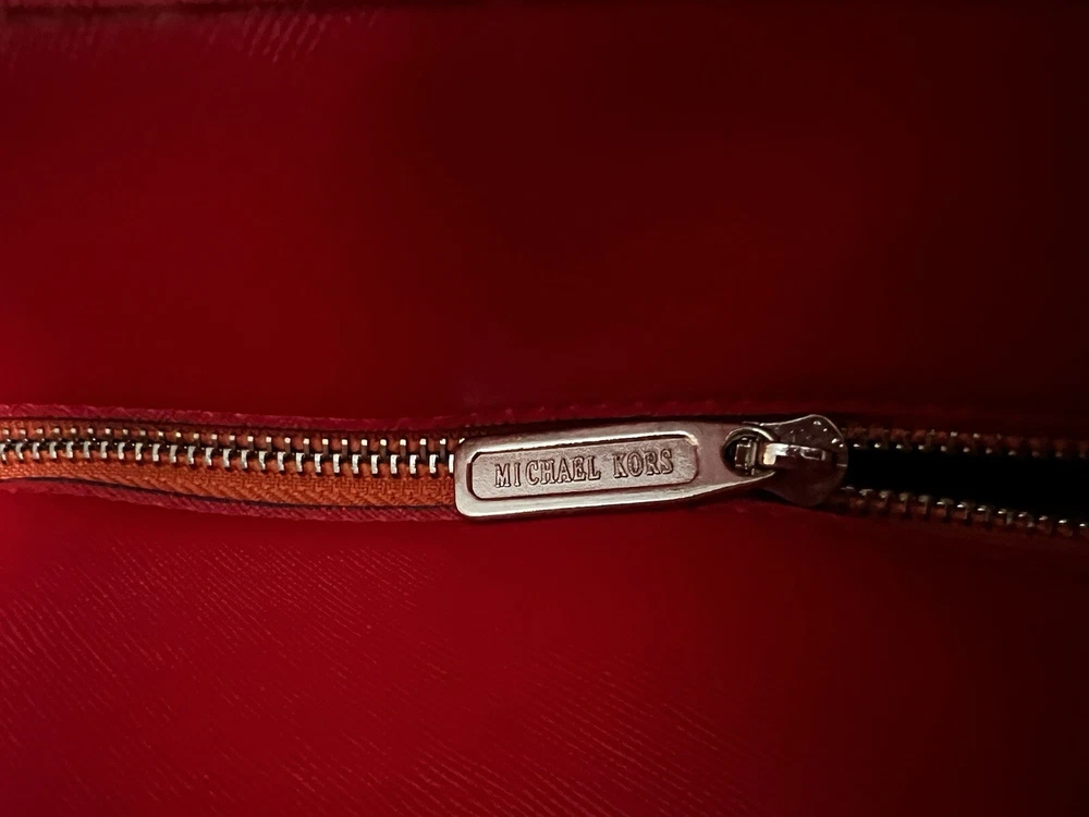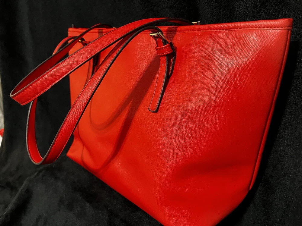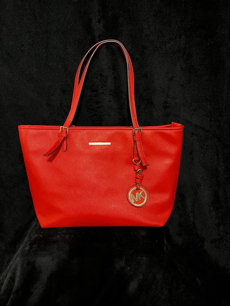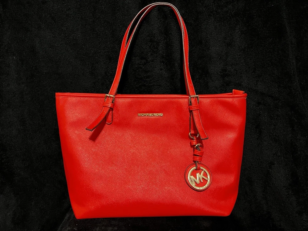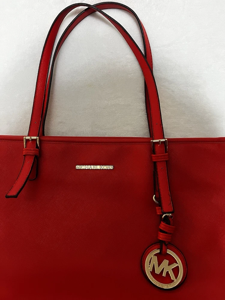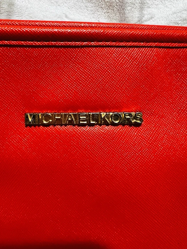 This Michael Kors Jet Set travel tote is a stylish and practical option for any woman on the go. The radiant orange exterior is made of high-quality saffiano leather and features a gold-plated hardware. The bag has a zip closure and double handles, with a 9.25" drop for comfortable carrying.The tote has a solid pattern and features a Michael Kors logo accent. It has inner pockets for added organization and is stain-resistant, making it perfect for travel. The bag also comes with a bag charm accessory and has a medium size, measuring 15" in width, 11" in height, and 6" in depth. This classic piece is a must-have for any fashion-savvy woman.