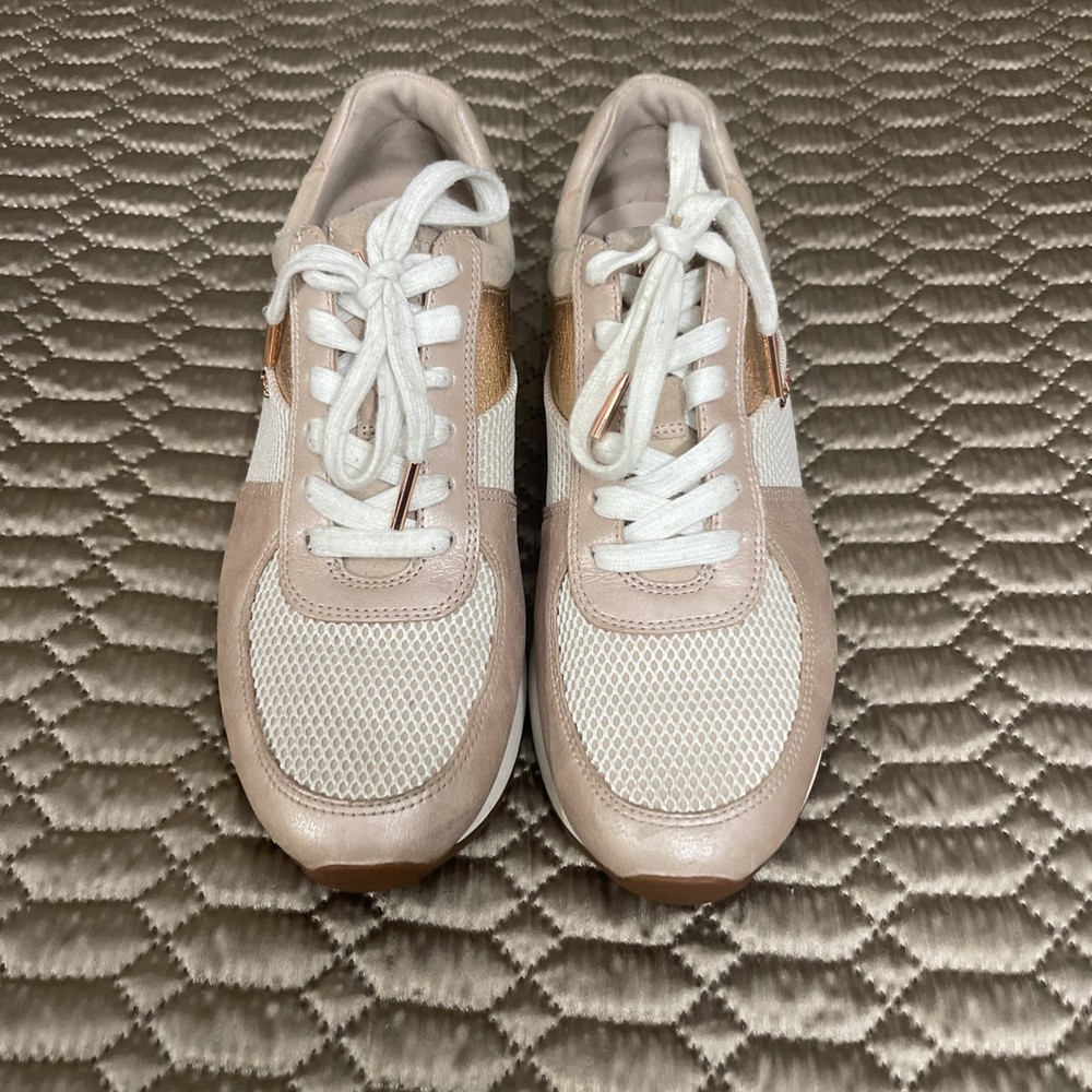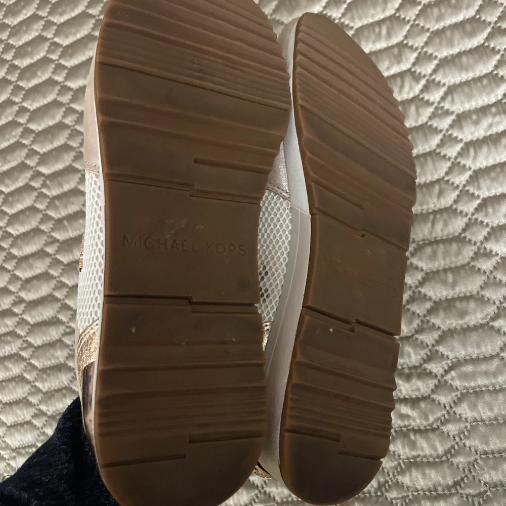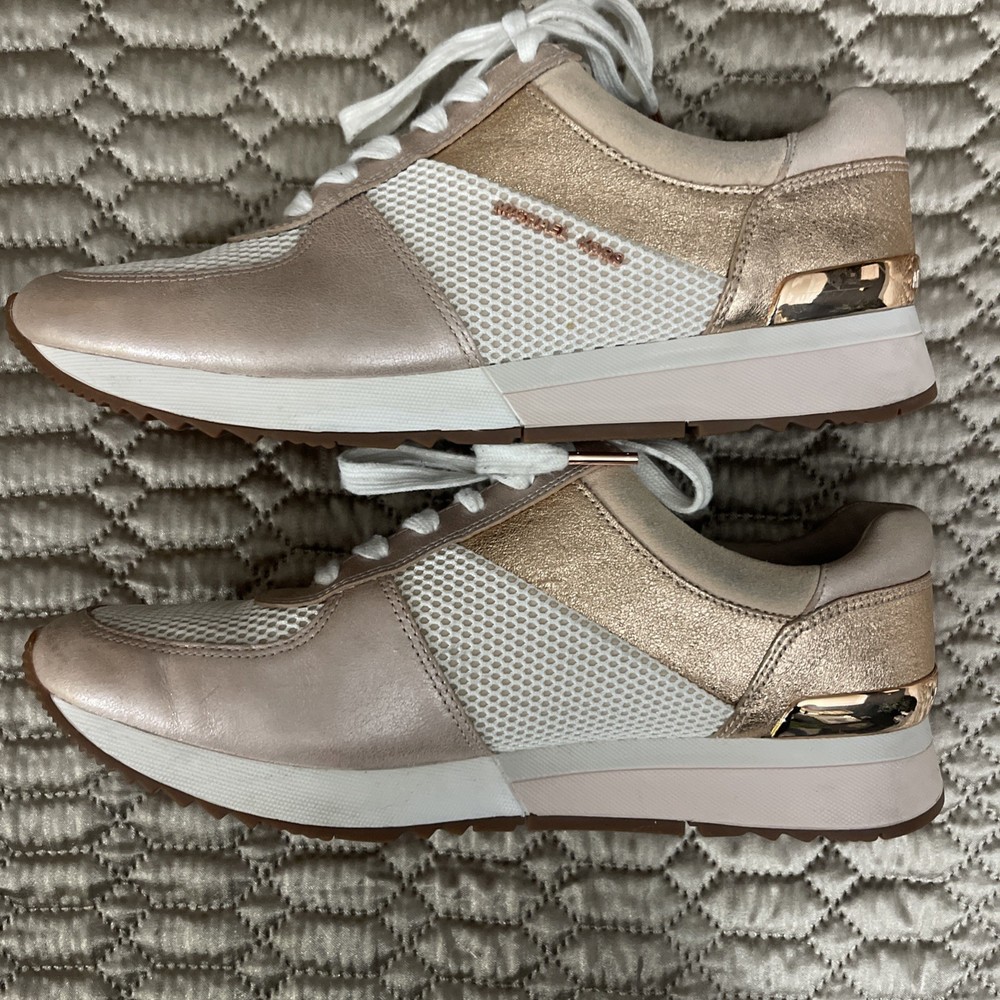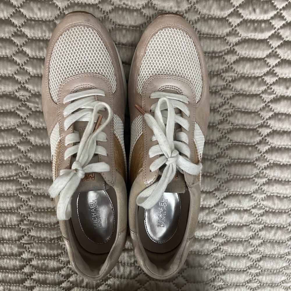 These Michael Kors Women's Size 10 Rose Gold Lace Up Fashion Sneakers are a stylish and comfortable option for casual wear during the summer, fall, or spring seasons. Made with a leather upper material and a rubber outsole, these sneakers feature a low top shaft style with a lace-up closure. The rose gold color adds a touch of glam, while the Michael Kors logo accents provide a signature look. Whether you're walking or just looking for a fashionable athleisure shoe, these sneakers offer both comfort and style for the modern woman.