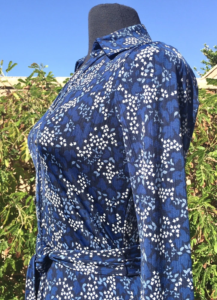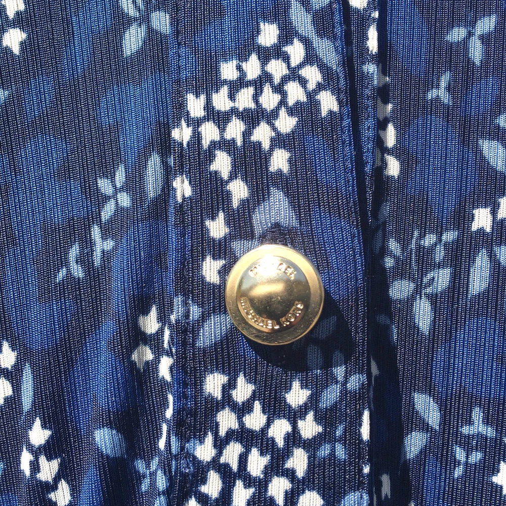 This Michael Kors shirt dress in size XS is perfect for any occasion. The dress features a beautiful blue and white floral pattern that is perfect for summer, fall, and spring. The V-neckline and button closure add a touch of elegance to the dress, while the waist sash and long sleeves make it suitable for both casual and formal events. The dress is made from a soft polyester blend jersey fabric that is machine washable for easy care. It is a collared dress with a fitted long sleeve style, and it comes in a unit quantity of one. The dress is not personalized, vintage, or handmade, and it is suitable for women of all ages. MSRP$135.00