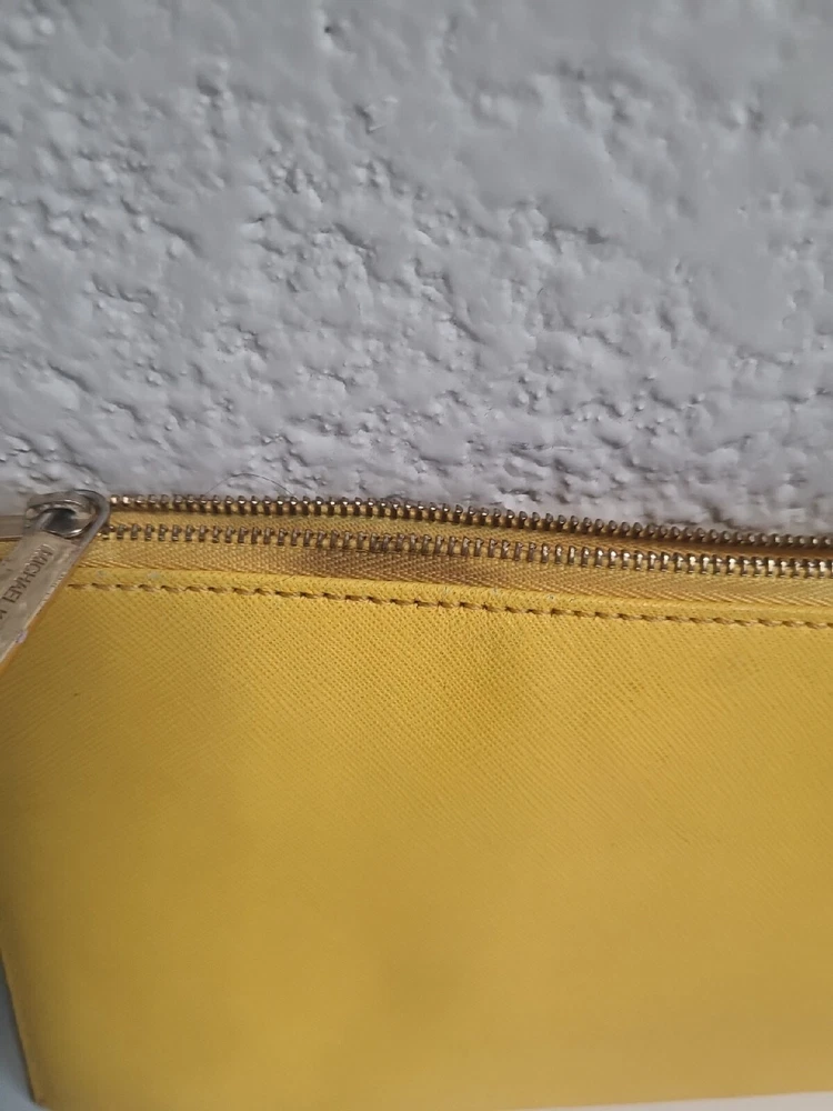 1. This chic Michael Kors clutch is a standout piece with its bold yellow color and stylish stud detailing. The compact size (10" x 5.5") makes it perfect for nights out. There’s minor discoloration near the zipper, but it’s barely noticeable. Great pre-owned condition at a steal! Shipping was smooth with USPS. Love it!