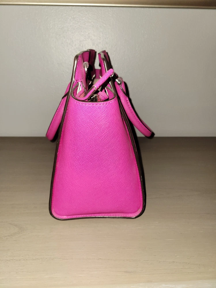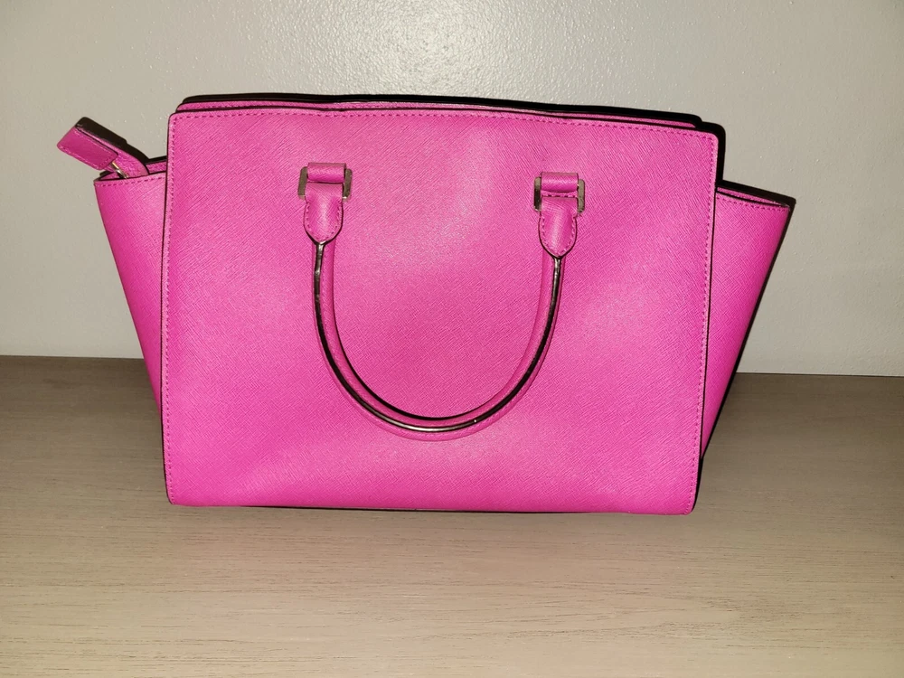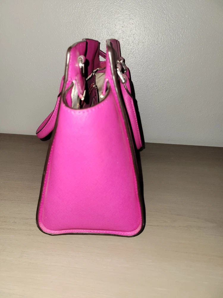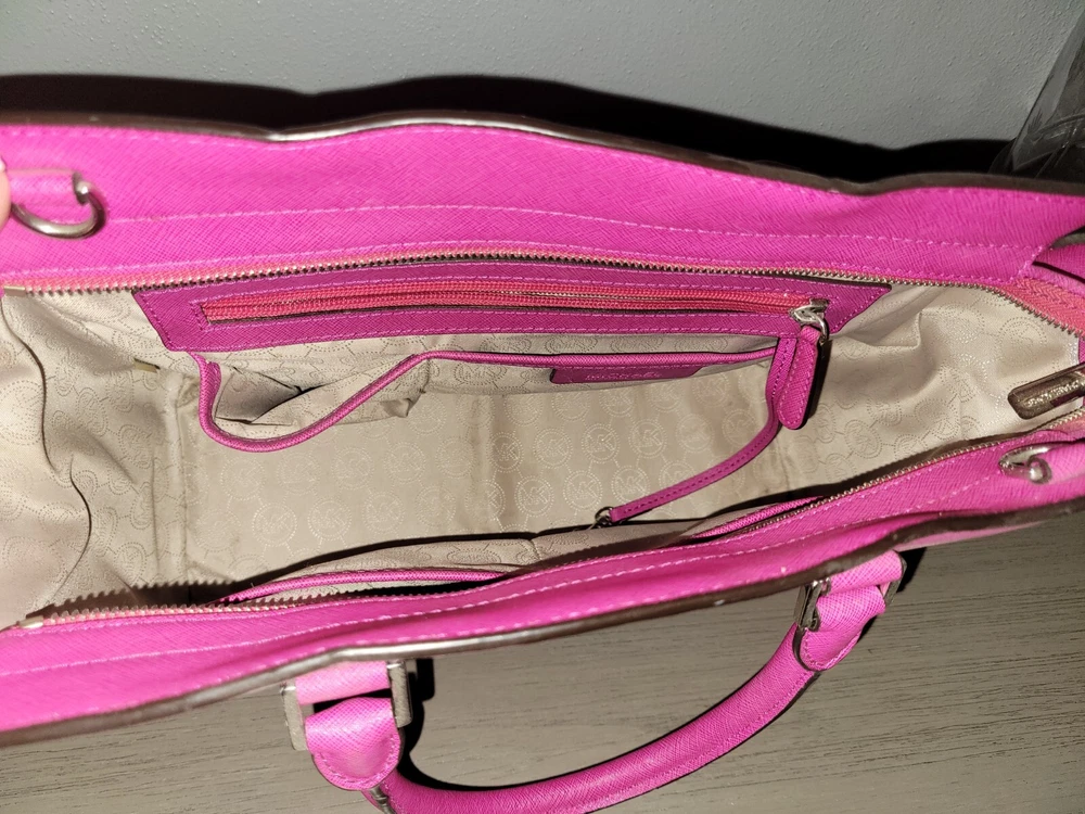 This Micheal Kors tote is a stylish addition to any wardrobe. The exterior is made of high-quality pink leather, perfect for making a statement. The bag is spacious and features a large compartment, making it ideal for everyday use. The strap is comfortable and the hardware is sleek, adding to the overall aesthetic. This bag is a great choice for any woman looking for a fashionable and functional accessory.
