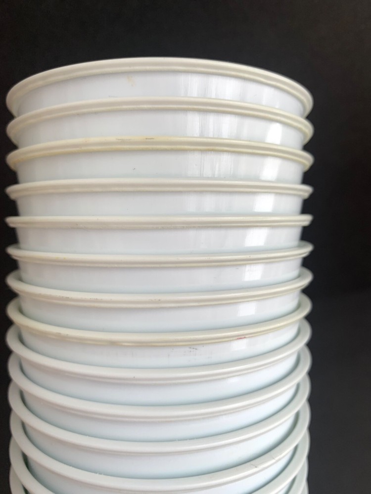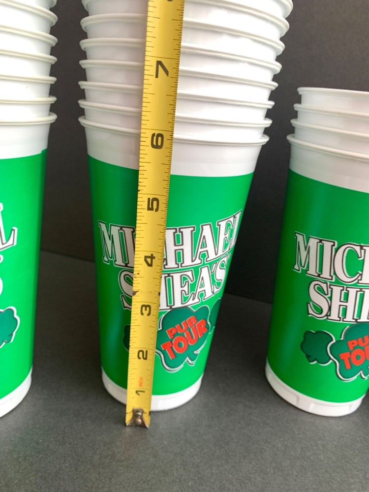 There are 35 vintage Michael Shea's Pub Tour disposable plastic party cups, beer cups. Green with shamrocks perfect for St. Patrick's Day. There is some discoloration around the outside of the white rim on a few of them as shown in the photos. See the photo for all details and measurements. These are old and still in the plastic sleeve they originally came in but the sleeve was opened so they're not in total pristine condition. You can see in the photos the few that have discoloration around the outer top rim. Most are fine. Message me with any questions.