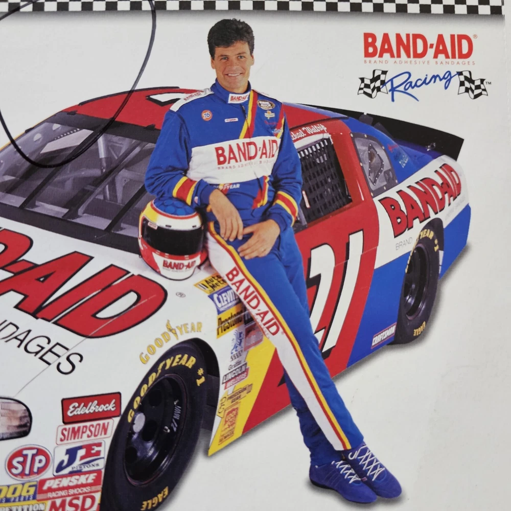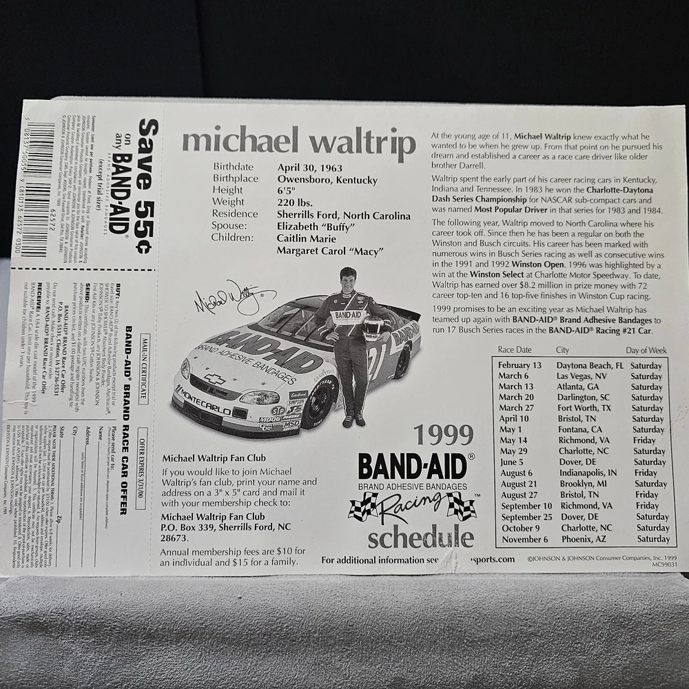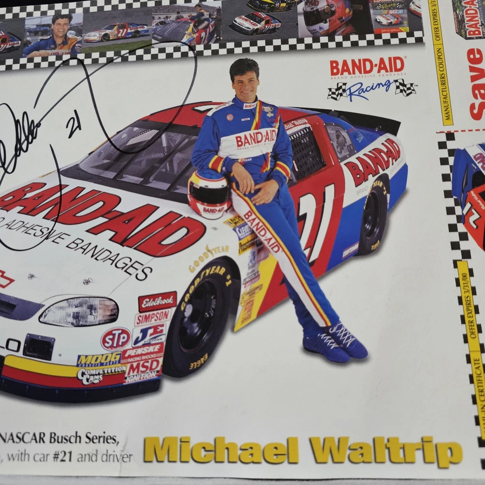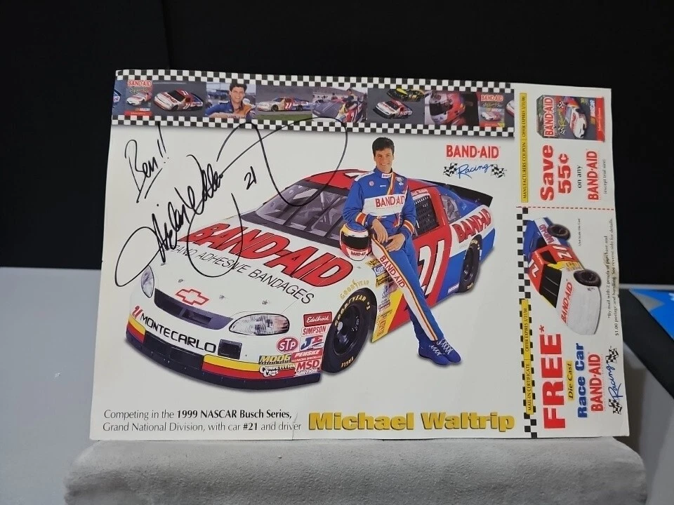 This remarkable photo card featuring Michael Waltrip's Band-Aid racecar is a must-have for any NASCAR fan. The autographed card is an original piece of memorabilia and comes with a coupon attached. This unique item is perfect for collectors or racing enthusiasts who want to show their love for the sport and one of its greatest drivers. Showcasing the iconic Band-Aid car, this photo card is ideal for framing or adding to your collection of NASCAR memorabilia. With Waltrip's signature proudly displayed, this original, autographed piece is sure to be a valuable addition to any collection. Don't miss out on the chance to own a piece of racing history! Photo is in pretty good condition. Coupons are still attached. There is some minor wear, please refer to photos for overall condition. Would be great in man-cave or a she-shed!