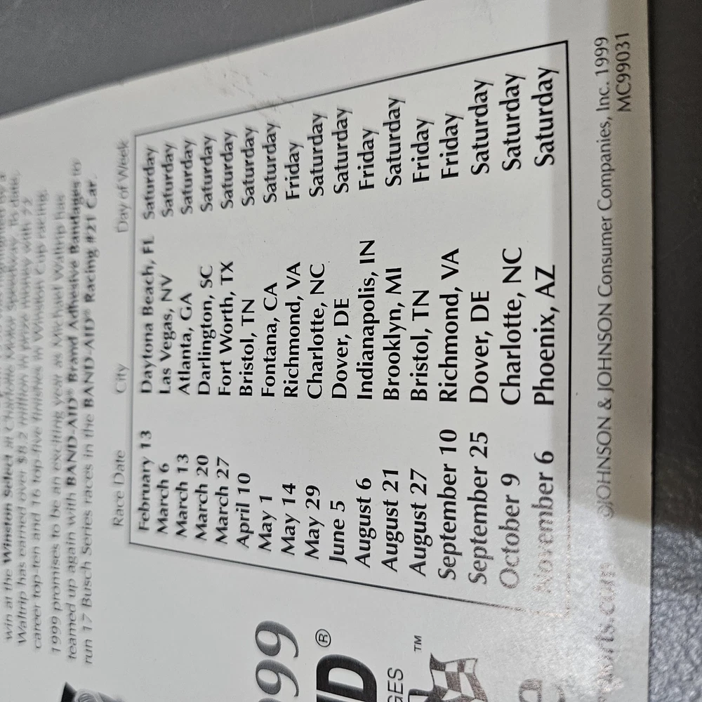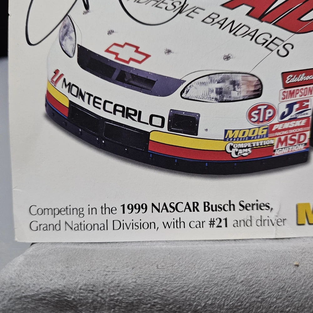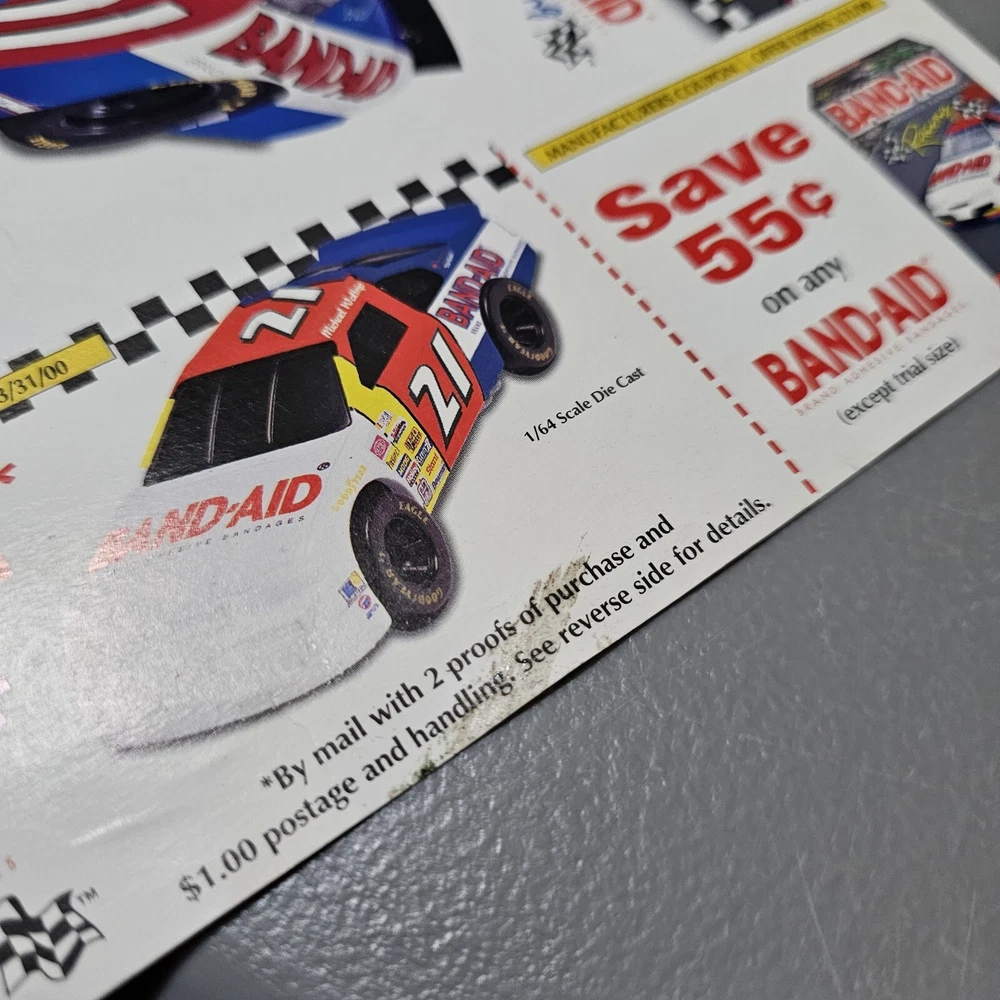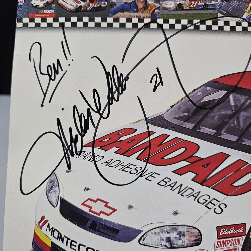 This remarkable photo card featuring Michael Waltrip's Band-Aid racecar is a must-have for any NASCAR fan. The autographed card is an original piece of memorabilia and comes with a coupon attached. This unique item is perfect for collectors or racing enthusiasts who want to show their love for the sport and one of its greatest drivers. Showcasing the iconic Band-Aid car, this photo card is ideal for framing or adding to your collection of NASCAR memorabilia. With Waltrip's signature proudly displayed, this original, autographed piece is sure to be a valuable addition to any collection. Don't miss out on the chance to own a piece of racing history! Photo is in pretty good condition. Coupons are still attached. There is some minor wear, please refer to photos for overall condition. Would be great in man-cave or a she-shed!