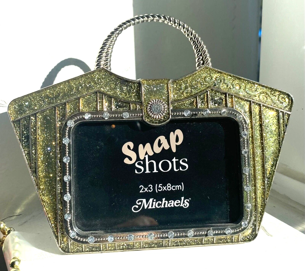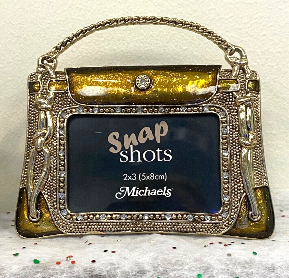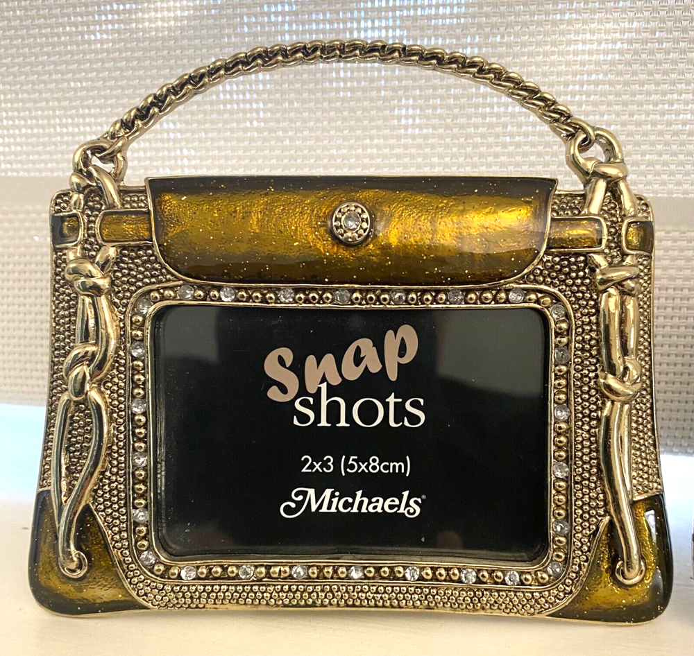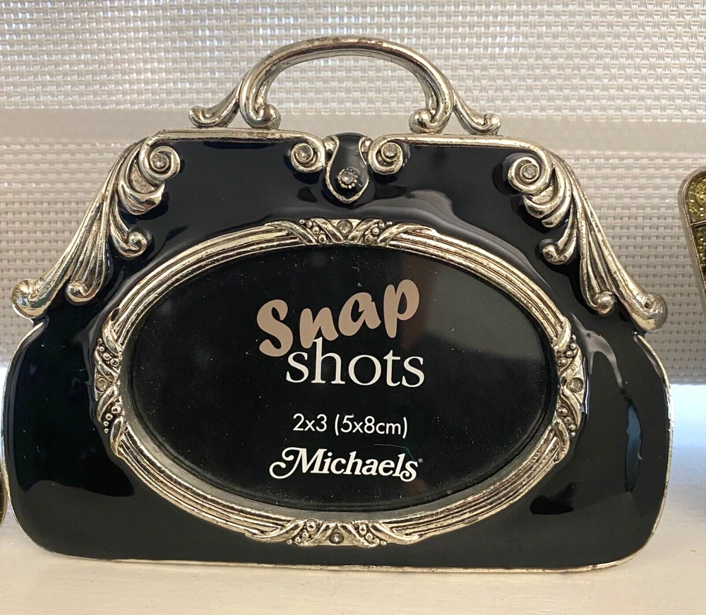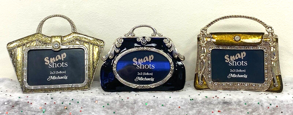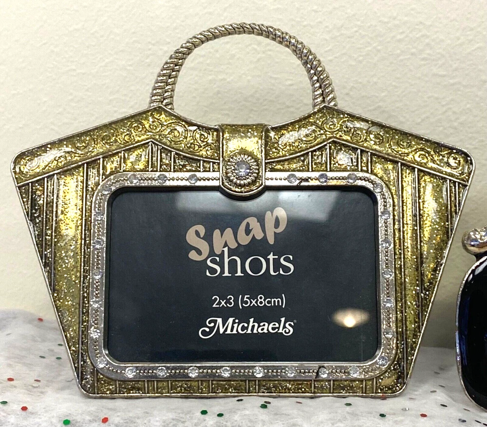 Finish: Glossy Style: Glamour Shape: Hand bag Item Height (Interior): 2 in Suitable for Photo Size: 2 x 3 in Mounting: Free Standing Theme: Photo Frame Pattern: Jeweled and Glittered Hand Bags Occasion: All Occasions Type: Photo Frames Country/Region of Manufacture: China Item Width (Interior): 2 in Photo Insertion Type: Rear-Loading MPN: 01130202439901 Glass Type: Clear Glass UPC: Does not apply Item Length: 1 in Power Source: Does not apply Size: 4.5 x 4 each Color: Black, Gold, Bronze, and Silver Brand: Michaels Features: Glitter gtin13: Does not apply Photo Capacity: 1 in each Frame Orientation: Portrait Material: Enamel, Glitter, and Rhinestones Item Width: 4.5 in Item Height: 4in