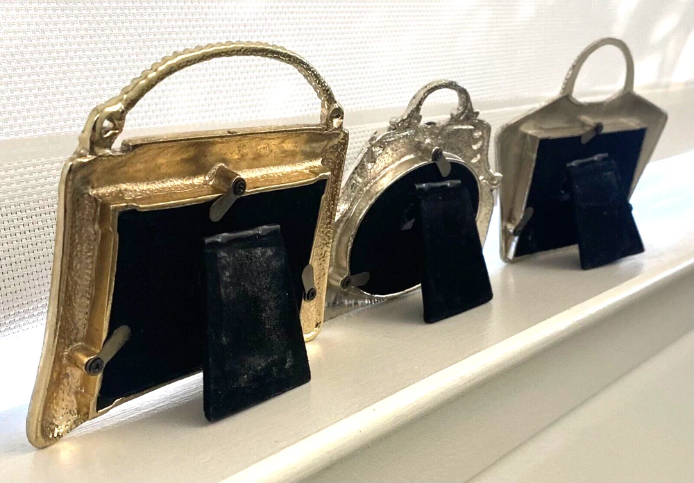 Display your cherished memories in style with this set of three Michaels Snap Shots Enamel Glittered & Rhinestone Mini Photo Frames. These frames feature a stunning Jeweled and Glittered Hand Bags pattern in Black, Gold, Bronze, and Silver colors, with a glossy finish that adds a touch of elegance to any room. Each frame can hold one photo, and they are suitable for all occasions, making them a perfect addition to your home décor.The frames are free-standing and can be easily mounted, with a rear-loading photo insertion type. They measure 4.5 x 4 inches each, with a clear glass type and a photo capacity of 1 inch per frame. These frames are made of high-quality Enamel, Glitter, and Rhinestones materials, ensuring that your photos will be safe and secure. Get this set of three photo frames today and fill your home with the magic of your memories. As these frames are used, they may contain minor imperfections, please check the photos carefully.