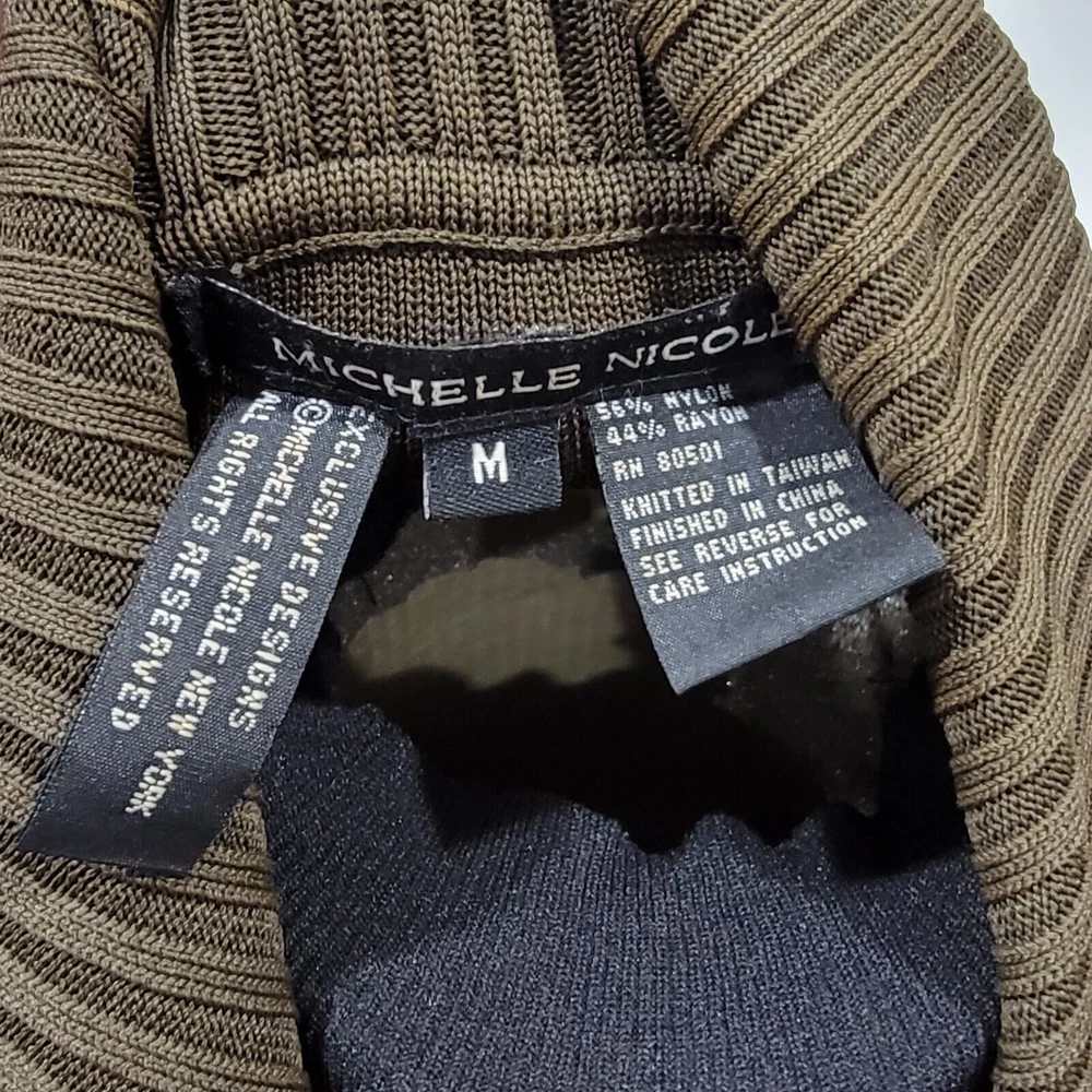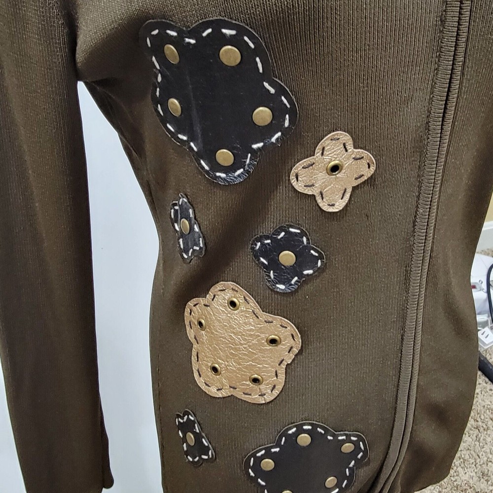 Michelle Nicole Olive Green Knit Sweater Full Zip Jacket Floral Patches Studs 3D. Size Medium. No Rips or Stains and is in Excellent Pre-Owned Condition. Cottagecore, Retro, Mature