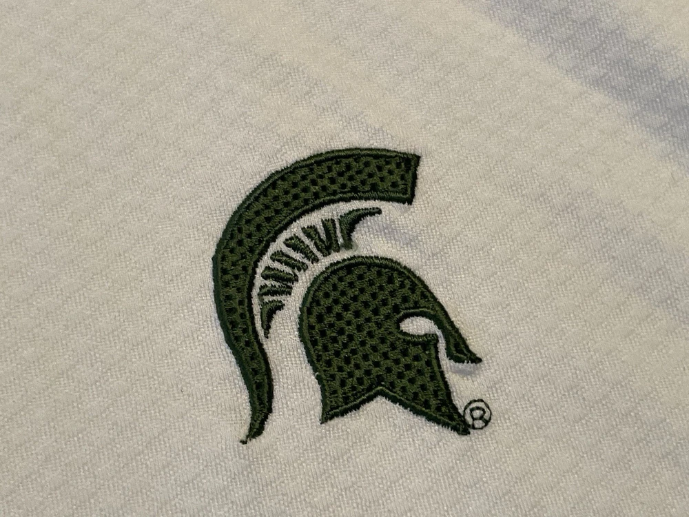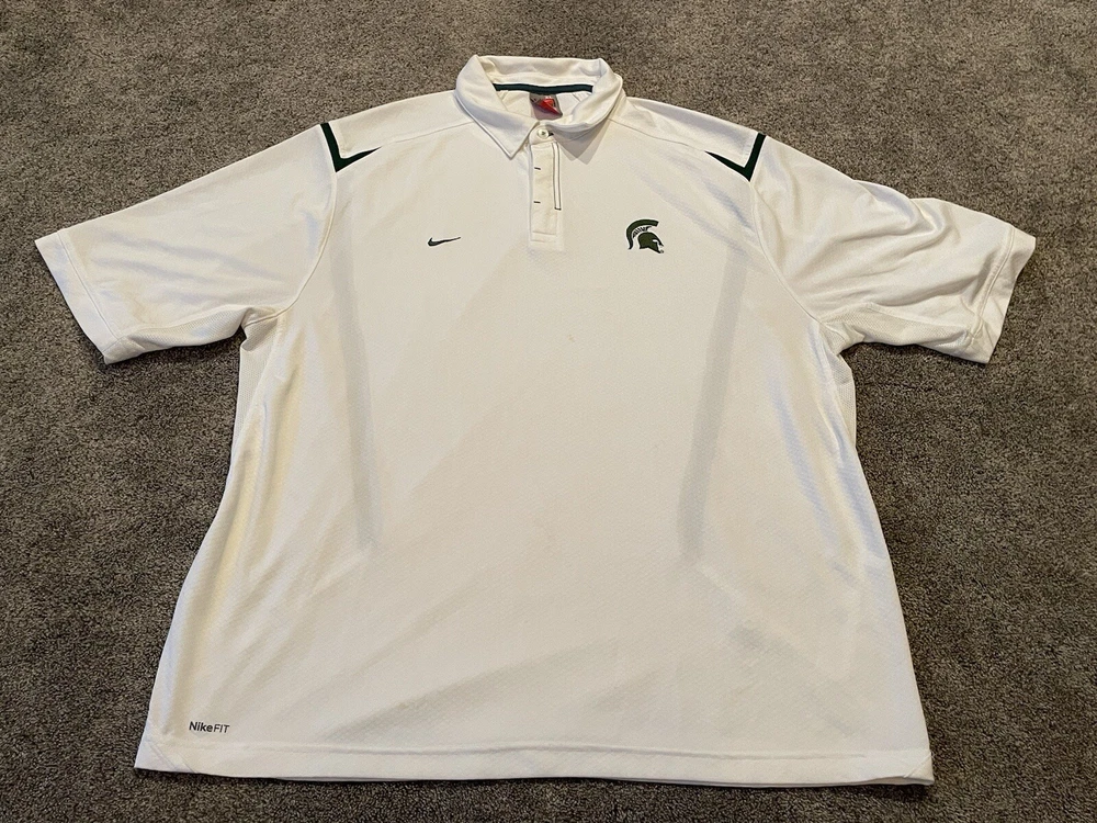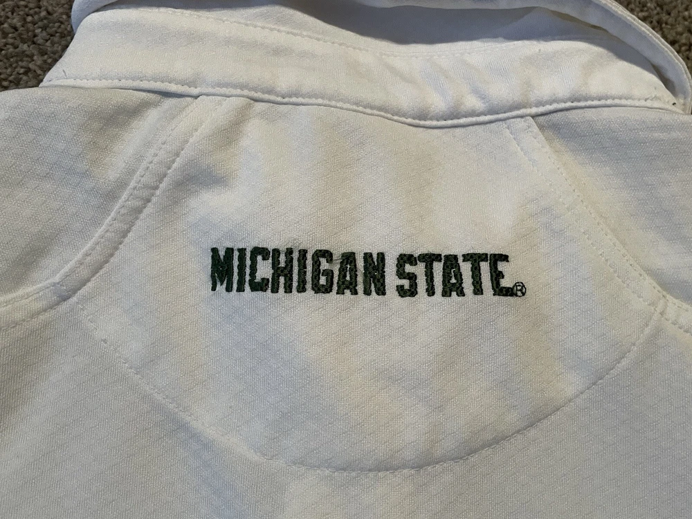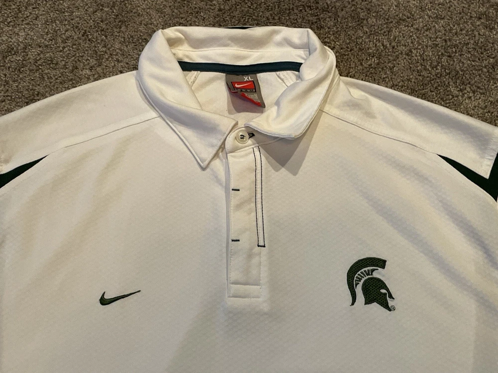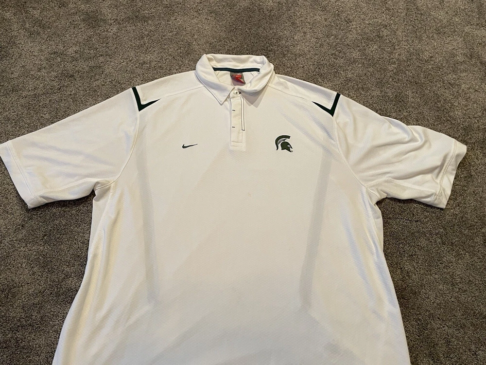 Elevate your game day attire with the Michigan State Spartans Polo Shirt. Designed for the ultimate fan, this white Nike Team Fit Dry polo is a staple for any supporter looking to combine style with comfort. Tailored to fit an XL, it's perfect for those who want to showcase their team pride without sacrificing a relaxed feel. Officially licensed by the NCAA, this polo is crafted to represent the Michigan State Spartans during the regular season and beyond. It's made in Indonesia, ensuring quality and durability, while the iconic Spartans branding makes it clear where your loyalties lie. Whether you're at the game or on the streets, this shirt is a consistent show of support for your favorite college football team. This item is preowned and shows signs of use and wear. Please see all photos for flaws and condition and please reach out with any further questions.
