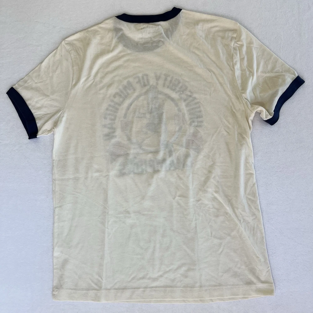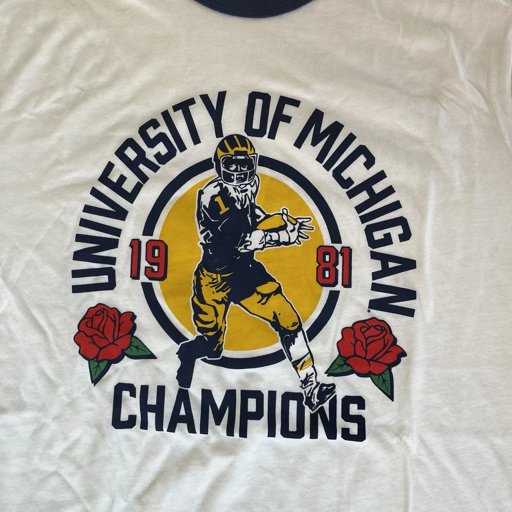 Homefield Brand (Wear One for The Team) Men's Size Larg Ringer T-Shirt Cream Color with Navy Blue Ringer Sleeve ends and Crew Neck Front printed, multi-color graphics commemorate Michigan's 1981 Rose Bowl win University of Michigan Wolverines, Big 10, NCAA Division I Soft Cotton/Polyester construction for comfort See photos for details, appearance and measurements Brand New Without Tags Buy It Now and Save $$ Inv#0463