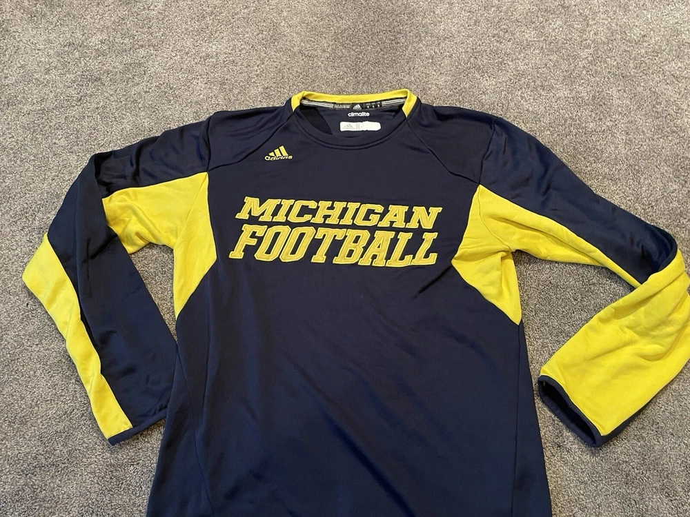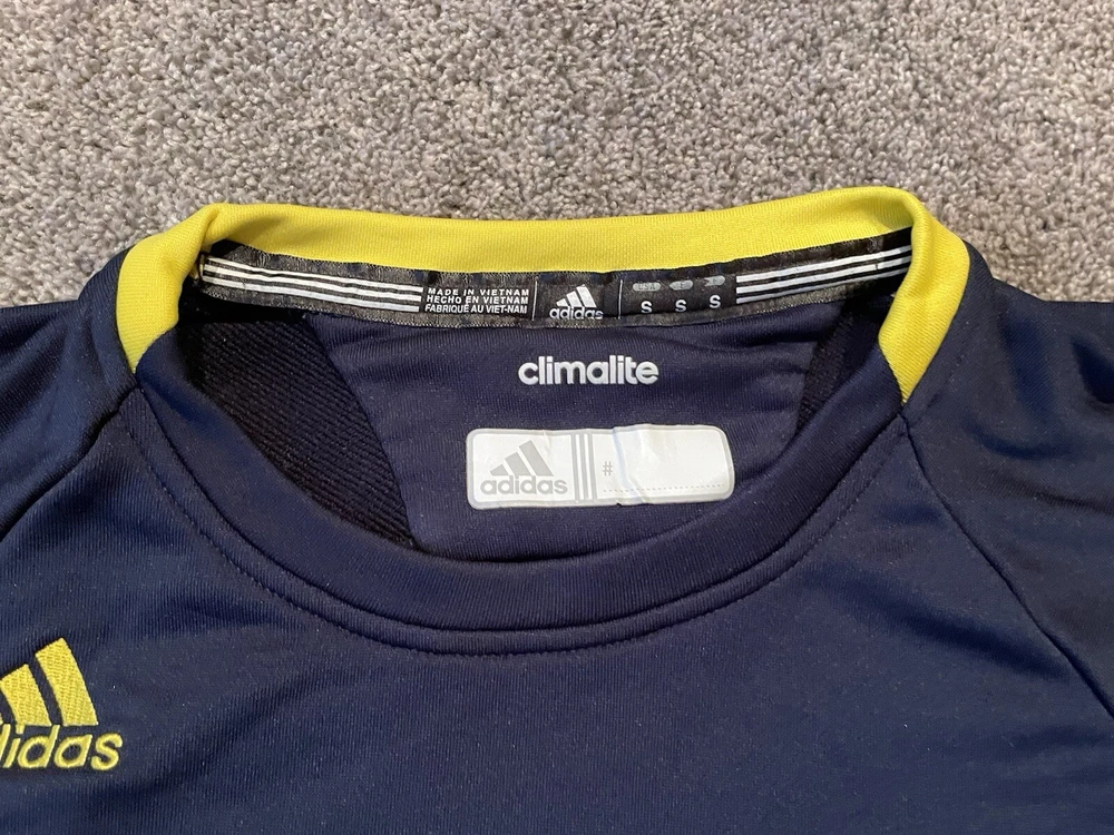 Elevate your game day attire with the Adidas Michigan Wolverines Climalite Warmup Shirt. Designed for the dedicated fan, this shirt features vibrant blue and yellow hues that showcase your team pride. The men's size small fits comfortably, allowing for ease of movement as you cheer on your team or hit the field. Crafted to provide both style and functionality, this shirt is a staple for any soccer enthusiast. The Climalite technology ensures you stay dry and comfortable, whether you're practicing or watching from the stands. An officially licensed product, it's perfect for regular season games and any soccer-related event.