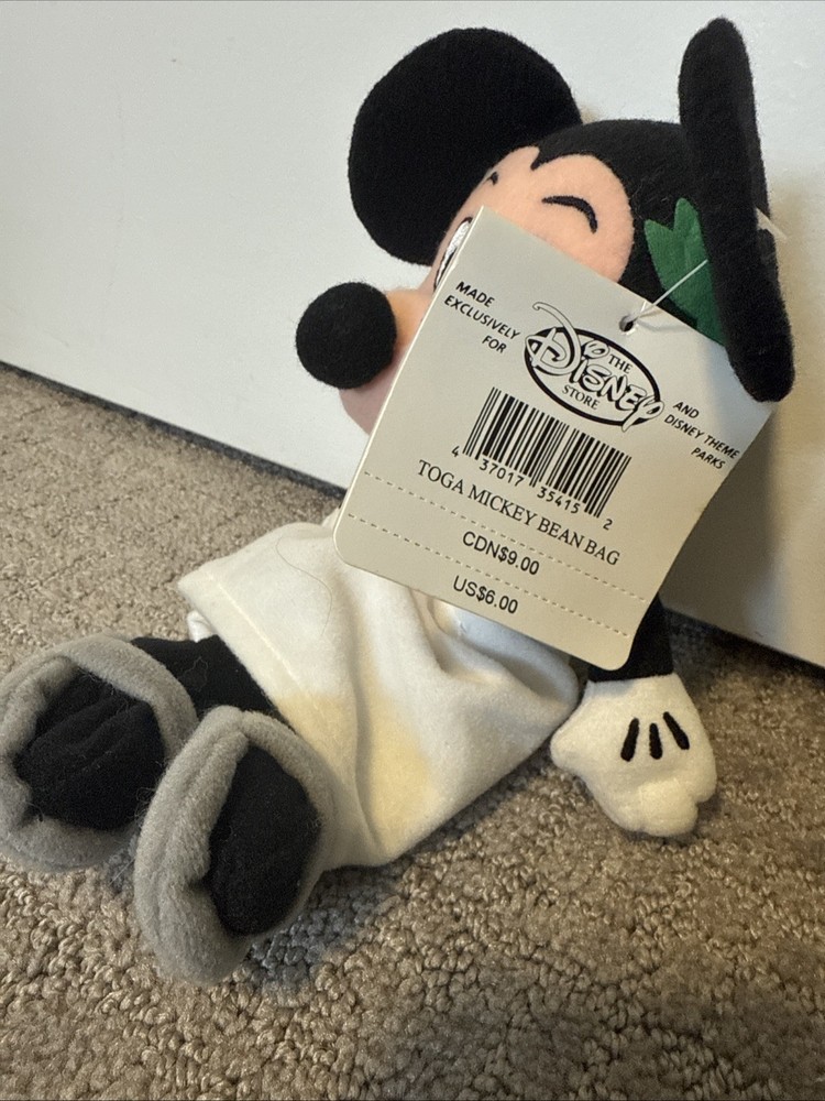 The product is a Mickey Mouse bean bag with a toga and laurel wreath headband, made by Disney Store. This collectible plush toy features the iconic character Mickey Mouse from the Disney franchise. Perfect for Disney fans and collectors, this item is a fun and unique addition to any Disneyana collection. With its whimsical design and high-quality construction, it is sure to delight fans of all ages.