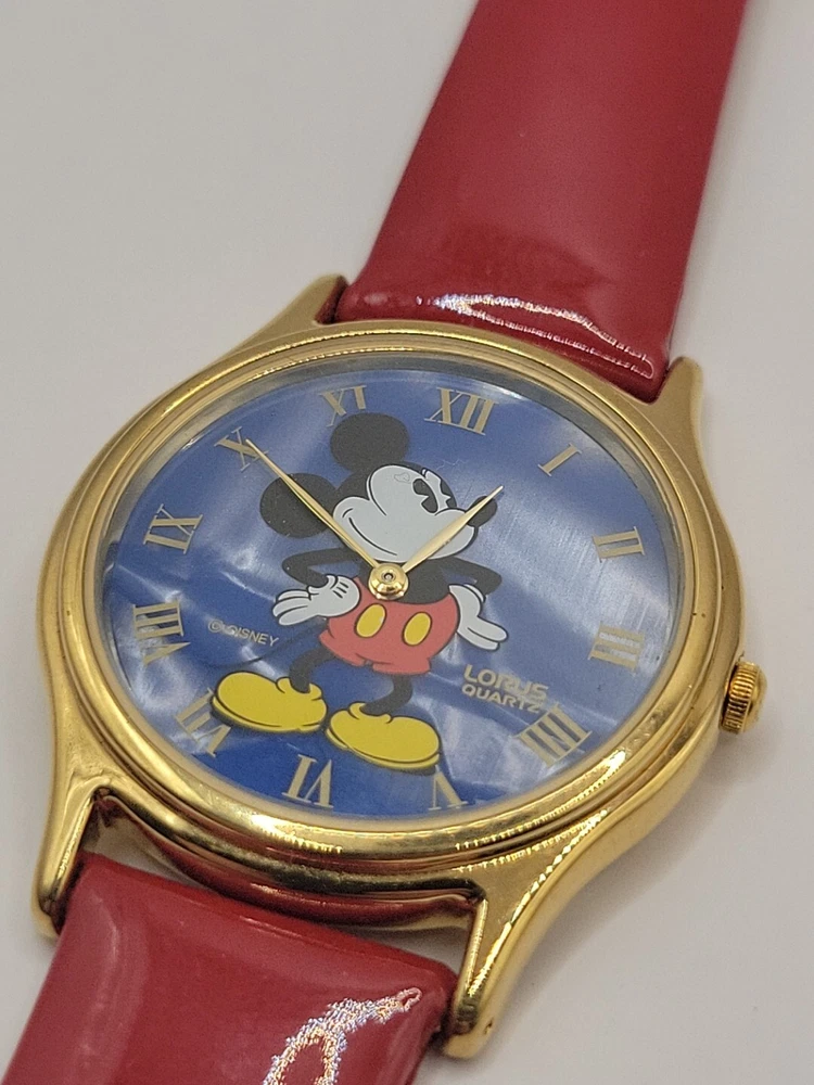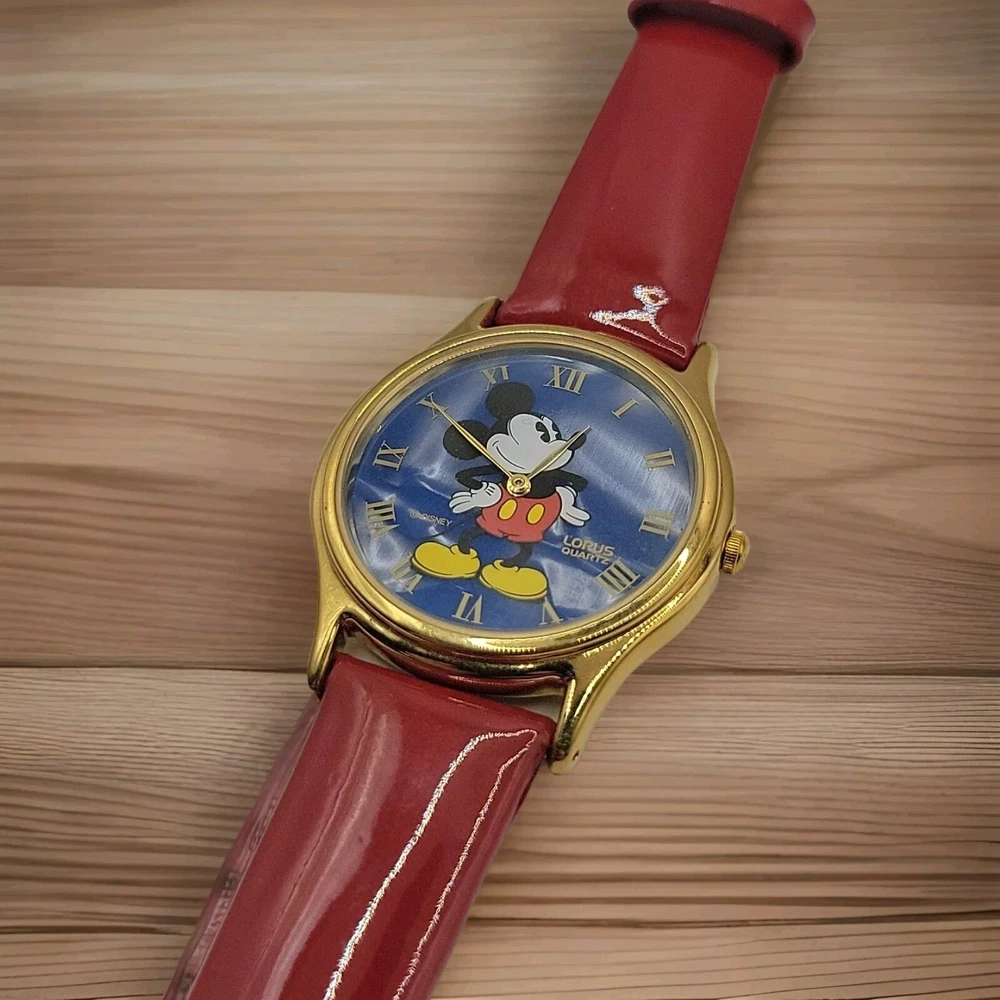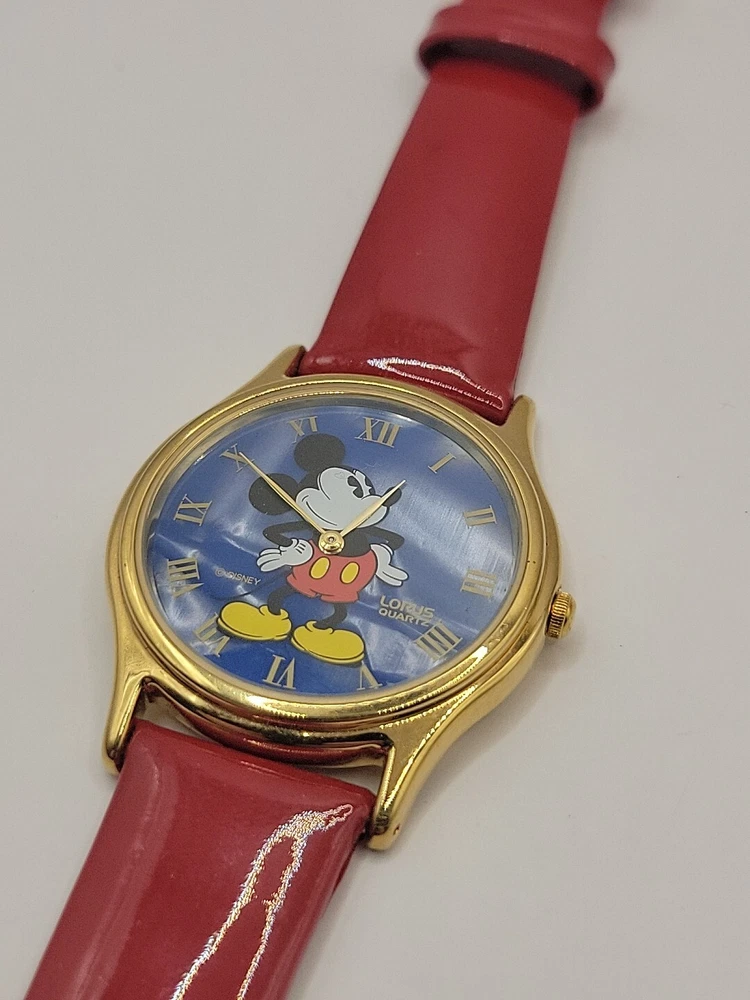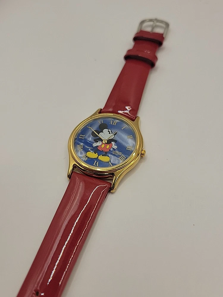New Battery Works Lotus Rare Red leather band in mint condition This lotus rare girls wristwatch features Mickey Mouse in a red band design, perfect for any Disney fan. The watch is adorned with blue cloud pearls and is a must-have for collectors of Disneyana. The brand is Disney and the character/story/theme is Mickey Mouse, making it a unique addition to any collection. The watch is perfect for everyday wear or as a collector's item.