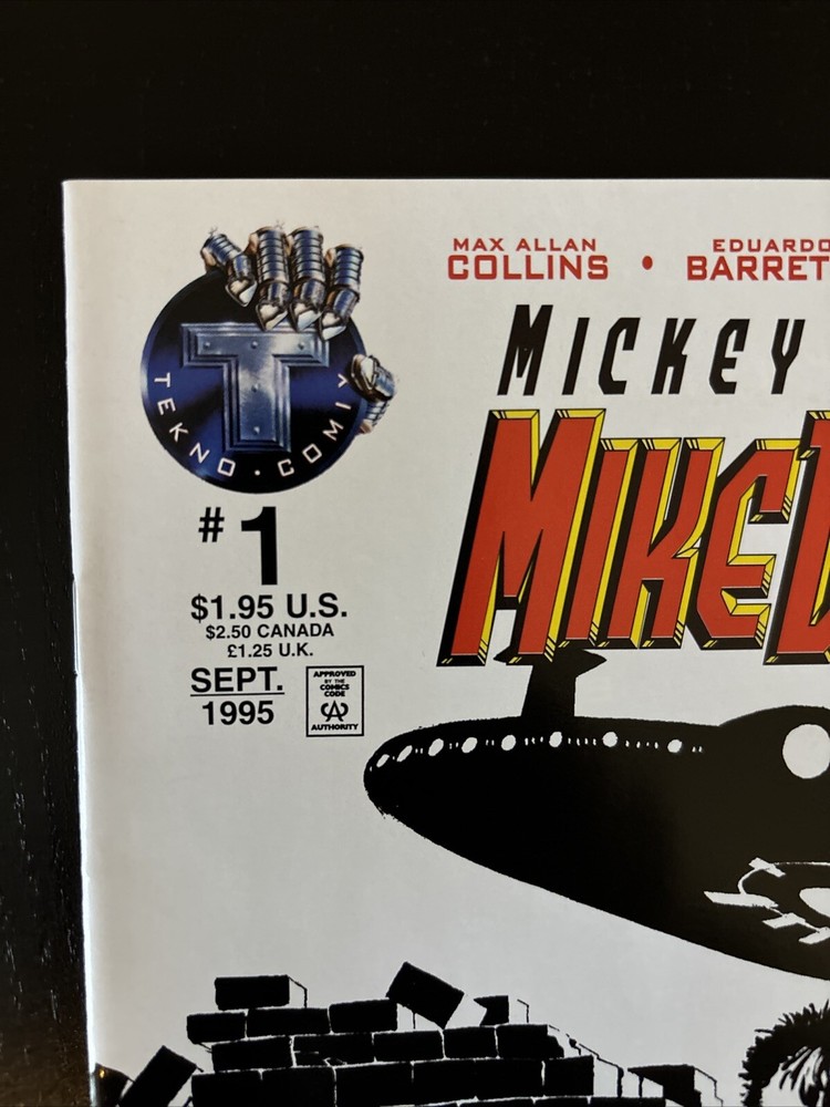 This is a vintage US comic book from 1995 titled "Mickey Spillane's Mike Danger #1." It is a crime noir comic in the Techno Comix universe, featuring artwork by Frank Miller and written by Max Allan Collins. This first printing newsstand variant is a single issue in English, with a color style and boarded with a dust jacket. The cover is also by Frank Miller.
