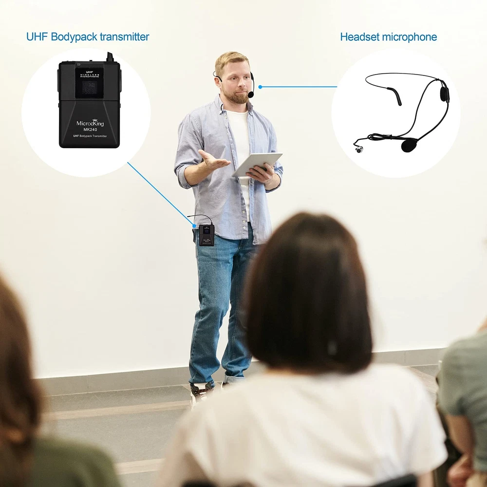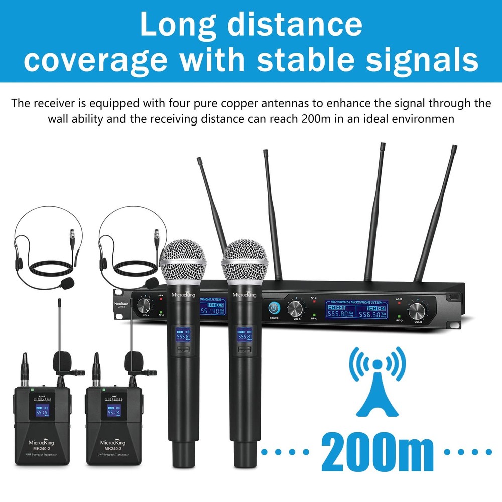 PRODUCT SPECIFICATION RF Frequency Range:500MHz Working Range:50m(approximately 200ft)under typical conditions Audio Frequency Response:50to18,000Hz-3dB Audio Output Level(+-20khz deviation, 1 KHZ tone):1/4-inch connector(into 3k load): -8.8dbv(Hi Z),XLR connector RF Sensitivity:85dbm, typical System Distortion(ef +15 deaton, 1 KHZ modulation):0.4% Power Requirements:Handheld and Bady-pack,3V battery Current Drain: Transmitter: 50MA average(70MA max) Receiver: 100MA average(130mamax) Operating Temperature Range: -20 to 50 (-4"to 122 F ). NOTE: Battery characteristics may limit this range Matters Needing Attention 1. You will need an extra audio equipment like speaker to connect with this product to make the sound working. 2. Please keep the receiver away from the metal or any digital devices (such as computers, cellphones, etc.) to avoid potential sources of interference. 3.The receiver should be more than 1m from the ground. Please avoid to be against a wall. 4.Please do not use the microphone facing the receiver too closely, in order to avoid noise interference. 5. Please do not flap the microphone head with hand, or it would be damaged. 6. During the performance or presentation lid the N/MEOFF sw to the MUTE position when the system is not being used7 When the pomme or present s d e m r N swh o t OFF posion to conserve battery Any problem, please contact us Durable: Rugged metal construction with handheld/flip lapel/headset/waist pack. High quality plastic beltpack with light weight for high sensitivity lavalier microphones and headphone microphones, ideal for small outdoor performances, conference rooms, classrooms, bars, dance halls, KTV rooms and complex high-end professional concert environments to achieve satisfactory results. Clear and pure sound quality: High-quality cardioid moving coil pickup head designed to limit feedback and interference, 4-channel wireless microphone set with fixed frequency design has superb signal stability and eliminates unwanted distortion. The microphone has a built-in high-quality chip to provide clear, smooth and optimal real sound. Wireless Performance Exceeds Expectations: wireless microphone system provides superior signal stability, eliminates radio interference and simplifies your preparation. Equipped with a professional receiver, LCD display showing frequency numbers and individual volume controls for precise vocal balance, the MK240-2 wireless microphone system is perfect for music lovers and sound engineers who need reliable, pristine sound. Rugged Material: PP microphone housing with metal mesh head and metal connectors for extra impact and corrosion resistance Receiver with four XLR outputs and one 1/4'' audio output jack for plug-and-play, easy setup, and individual volume control for each wireless microphone. UHF microphone system with voice compression and expansion technology, microphone with anti-vibration ring, easy to use, powerful and stable performance. Focus on service: 2 x handheld microphone, 1 x receiver case, 2 x lavalier belt pouch, 2 x headphones, 4 x antenna, 1 x user manual. If your microphone has no sound, please make sure your microphone and receiver have enough power.