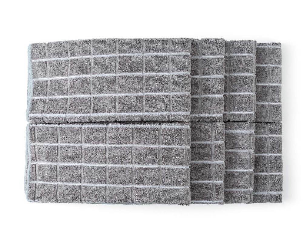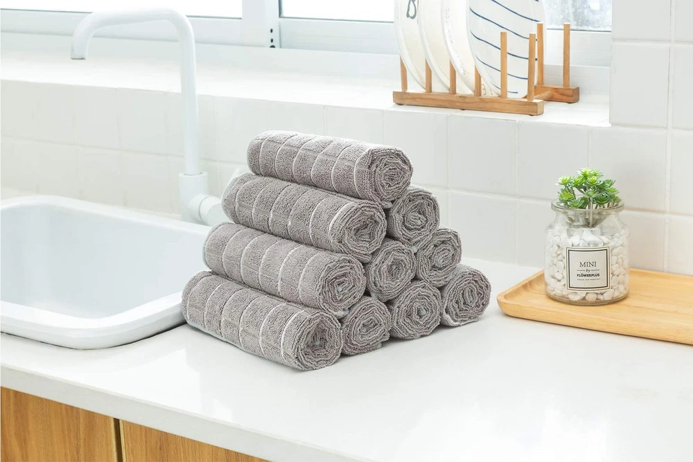 These kitchen dish towels are capable of: - Soft and plush, this microfiber kitchen towel will not scratch surfaces - Withstands repeated washing and continues to perform perfectly - Come in a set of 8 pieces with lattice gray color design, bringing elegance and fashion to your kitchen. About towel is an innovative microfiber towel brand. Our products are different from those in a dollar supermarket. Our concept is to improve kitchen towels for the purpose of improving the experience of our customers. If you like to try new things, you would better to choose our dish towels since we improve the products all the time according to the feedback of customer. If you want to give your family and friends a special gift, our kitchen hand towels will also be a nice choice! If you think these towels are not as expected, you can contact us for full refunding any time! Product instructions: Wash before the first use in temperature below 60 degree. Machine washable and dry-able. No fabric softener or bleach. SUPER ABSORBENT - Microfiber material has super absorbent water ability of the towels which could absorb water 6 times of itself. GENEROUSLY SIZED - Each towel measures 26 x 18 inches perfect size. This dish towel is oversize and good for kitchen as kitchen napkins. DURABLE & GOOD SHAPE - With excellent sewing process, the kitchen towel can always stay in a good shape after thrown into a washer. Shrink will not happen all the time even after tons of washing. THICK & SOFT - Luxuriously soft, thick and plush. According to the needs of consumers, we improve the microfiber kitchen towel feeling softer and thicker. SPECIAL TIPS - Recommended to wash the kitchen towels before use. The absorbency will increase with each wash.