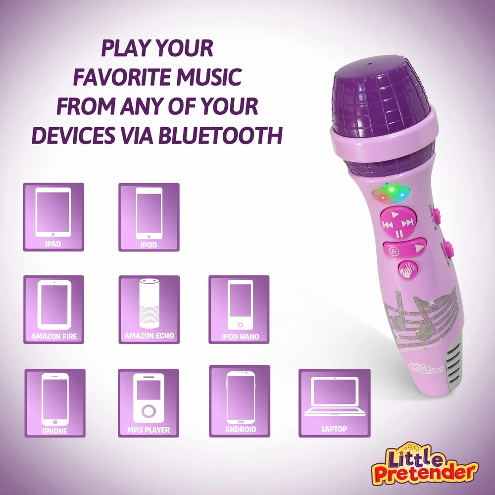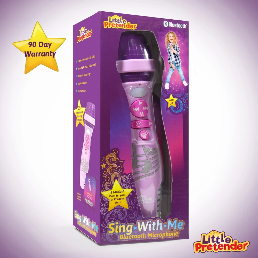 BLUETOOTH KARAOKE MIC – Let your little rock star belt out the lyrics on this toddler microphone designed especially for her. Features like Bluetooth connectivity, 2 singing modes, a voice changer, 15 preinstalled songs and a lyric book make it a must have for any music loving kid. 15 PREINSTALLED NURSERY RHYMES – This pink and purple microphone toy comes loaded with 15 of her favorite nursery rhymes like The ABC Song and If You’re Happy and You Know It. Just press play and use the included song book to get all the lyrics right. DUET & LYRICS OR KARAOKE ONLY – She can sing along to the classics in Duet & Lyrics Mode, or go straight to Karaoke Mode, with the music and song book to guide her. 100 SECOND RECORD & PLAYBACK – Listen to your composition with the record and playback buttons, then try the voice changer for a laugh. Pop in 3 AAA batteries to start singing. FLASHING LED LIGHTS & APPLAUSE – Nothing says showtime like flashing lights and applause. This kids microphone supplies both with its flickering multicolored lights and applause button. Encore!