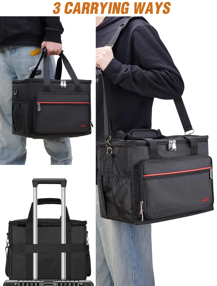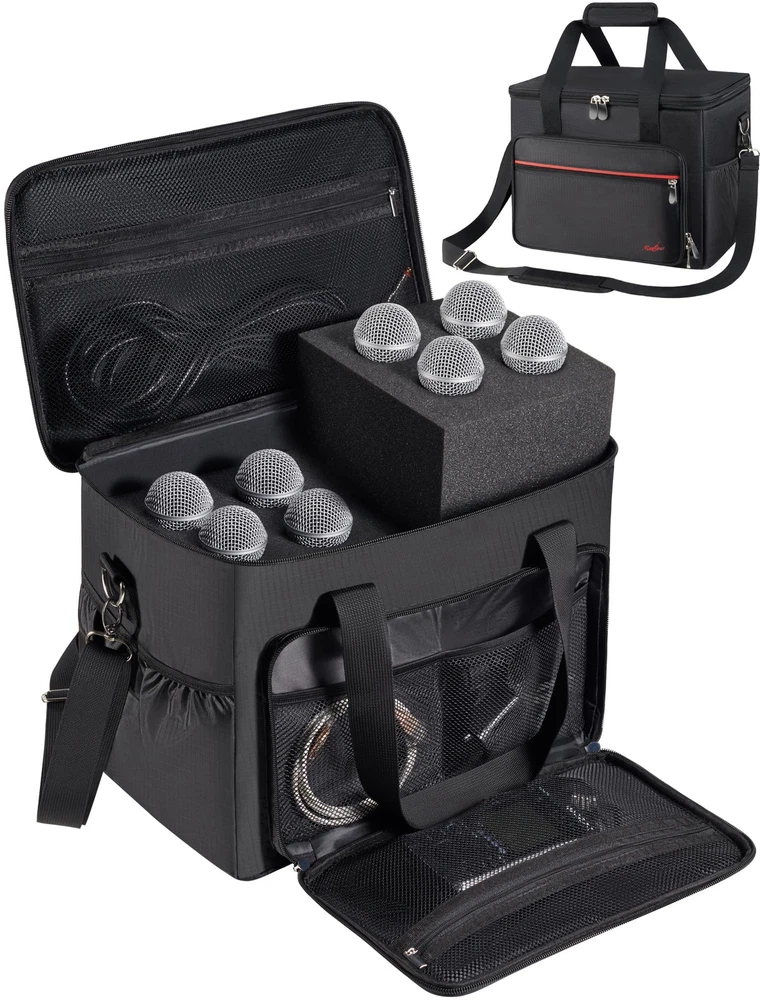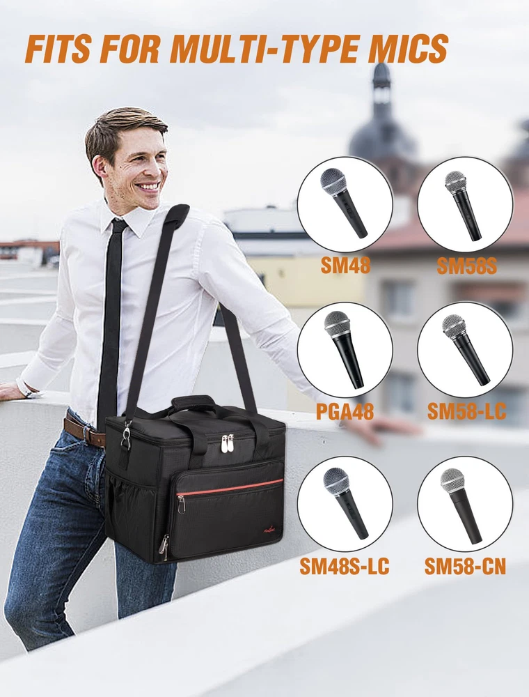 Secure Padded Protection: Worried about your precious microphones get shocked? The microphone bag features a thickened interior foam pad to hold the standard dynamic microphones or wireless stage microphones securely like a cloud coddling a newborn. When the zipper shut, the solid construction would ensure the mics snugly held and not bouncing around in the microphone storage bag. 8+ Pockets for Mics and Cables: To fit both wire mics and wireless mics accessories, we design as many pockets as possible. There is a zippered mesh pockets on the lid to prevent stuffs falling out. The separate zippered front pouch has more than adequate room for your mic stand clips and charger. There are 2 side pockets of the microphone carrying bag for guitar picks, handheld recorder, and cables. The front interior mesh compartment could also hold a compact mixer and small di box. Fits for Wired and Wireless Mics: If you are looking for a case compared to other microphone case only suit for one kind of microphone, this microphone organizer case specially designed for both short wired vocal mics like SM58, and those longer wireless mics, or standard condenser vocal mics like the Beta 87A, the soft padded lid can be expanded to accommodate even non standard square sized mics like the e609. How to inflate the foam? We recommend 3 methods to restore the sponge: 1. If you're not in a hurry, the best way is to let it naturally regain its shape over a period of 48 hours. 2. You can also use a hair dryer on a higher temperature and speed setting to inflate it. 3. Another option is to place it in the dryer on the "fluff" setting along with a couple of dryer balls to help expand it. 3 Ways Carrying: Hard to find a portable travel mics storage bag? This mics bag would be an excellent choice for light mobile use, especially perfect for the people engaged in podcasting, church events, karaoke shows, and road trips. Comes with a padded handle, allowing for one-handed carrying and an adjustable shoulder strap with padded to alleviate shoulder pressure. It also features a luggage belt on the backside, enabling to securely fasten the bag to the rolling suitcase to free up hands.