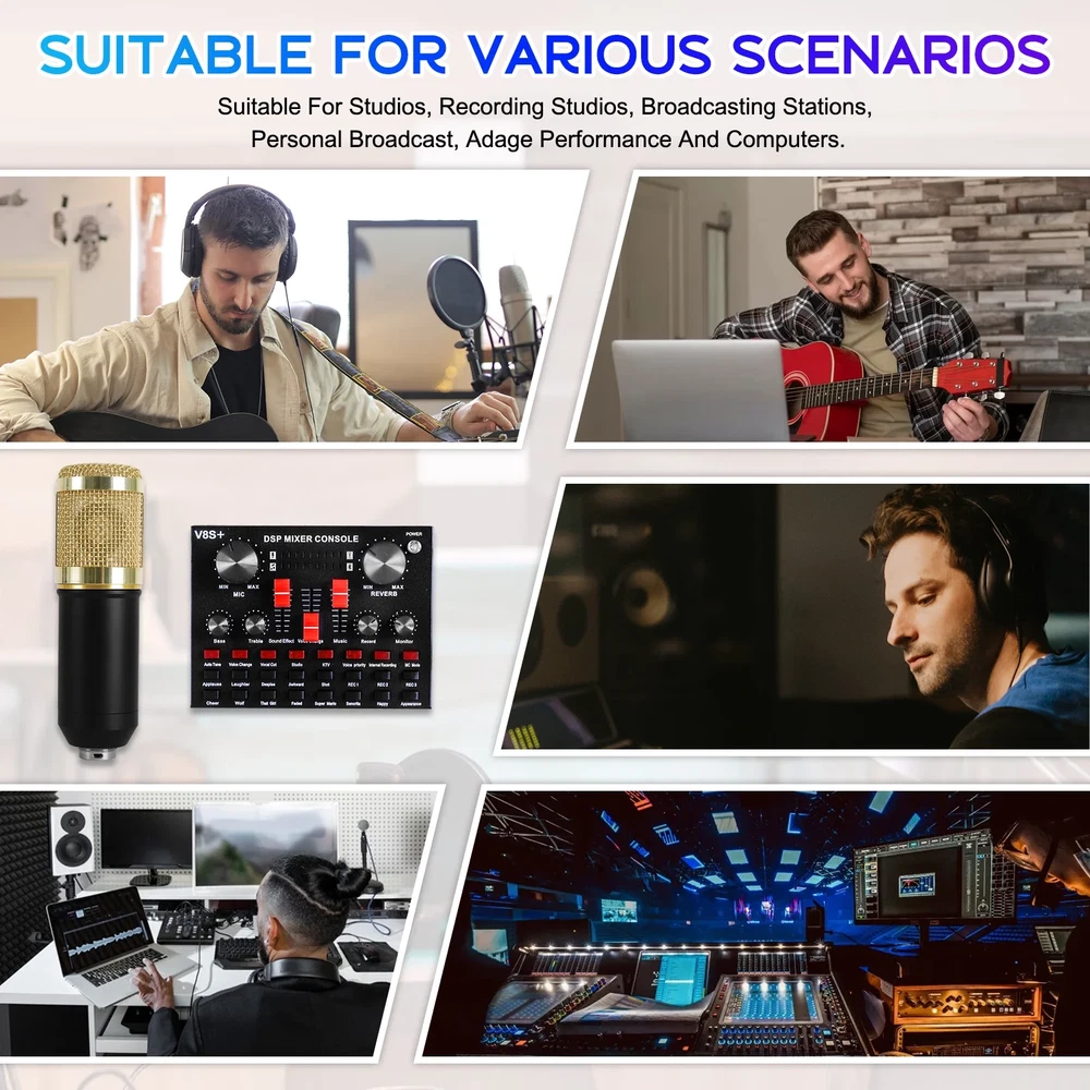 Capture crystal-clear audio with our professional-grade USB microphone.Designed for recording podcasts and live streaming, this studio microphone kit is equipped with advanced features, including an adjustable microphone stand and a high-quality sound card.Whether you're a content creator on TikTok, YouTube, or Twitch, our USB microphone ensures optimal sound quality and versatility. Delve into the world of online streaming with this top-rated microphone and elevate your audio production. Package Contents: 1*Nylon Filter 1*V8 Live Sound Card 1*BM-800 Condenser Microphone 1*Adjustable Microphone Stand 1*Faux-plastic Shock Mount 1*Microphone Windscreen 1*USB 3.5mm Charging Cable 1*USB 3.5mm Accompaniment Cable 1*USB 3.5mm Live Cable 2*English Manual Instruction Podcast equipment bundle with 2024 upgraded V8 sound card. Professional BM-800 podcast microphone - cardioid pickup mode provides original and accurate voice capture and reduces unwanted background noise. This condenser microphone bundle is easy to use, with no need to download the additional driver software, and suitable for recording equipment for Laptop/Computer Vlog Living Broadcast /YouTube TikTok live streaming. BM-800 Condenser Mic Kit with Live Sound Card, Shock Mount, Pop Filter, Mic Adjustable Suspension Scissor Arm Stand for Crystal Clear Sound (Gold)