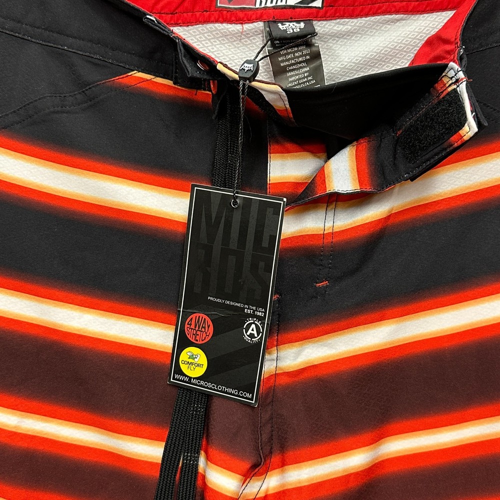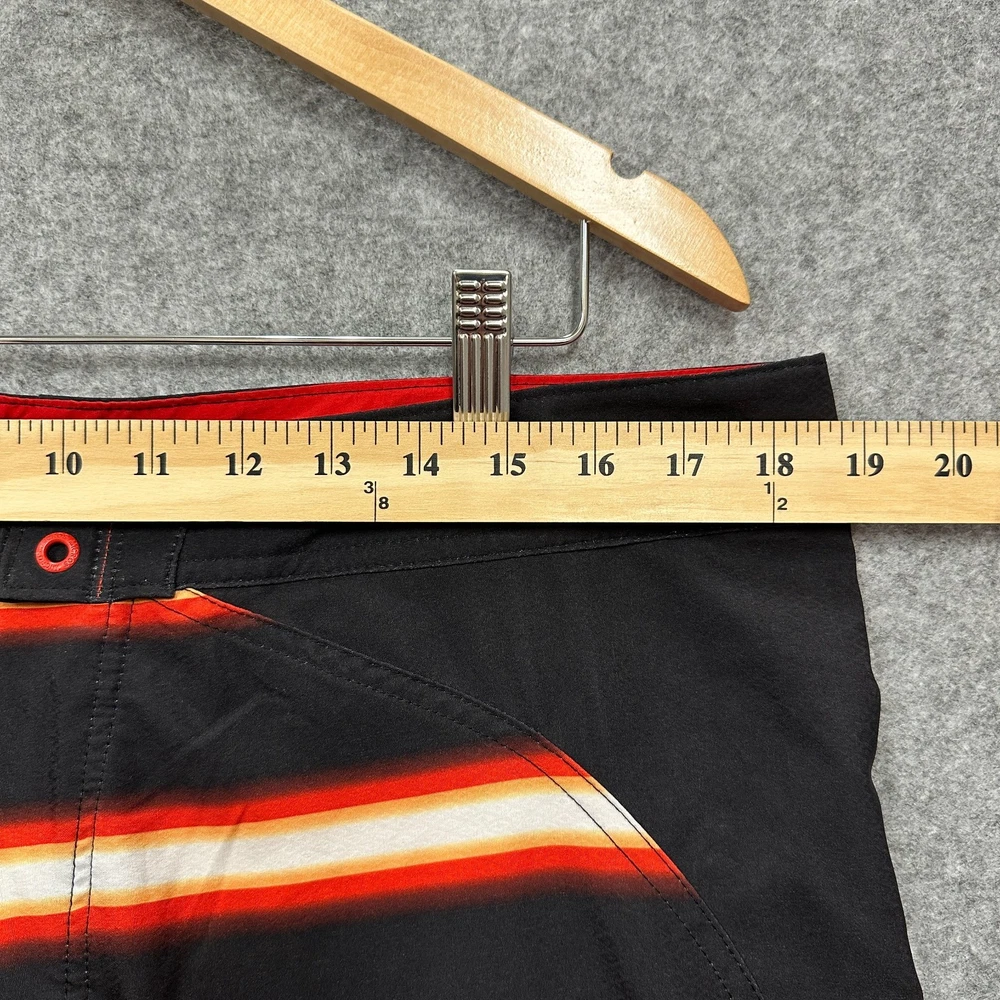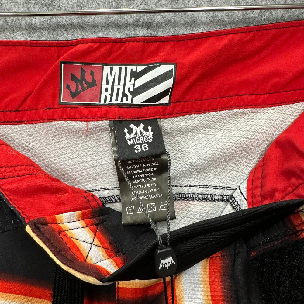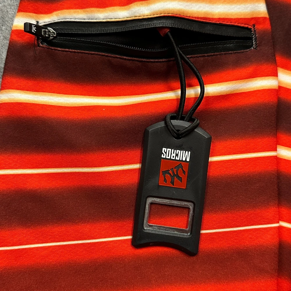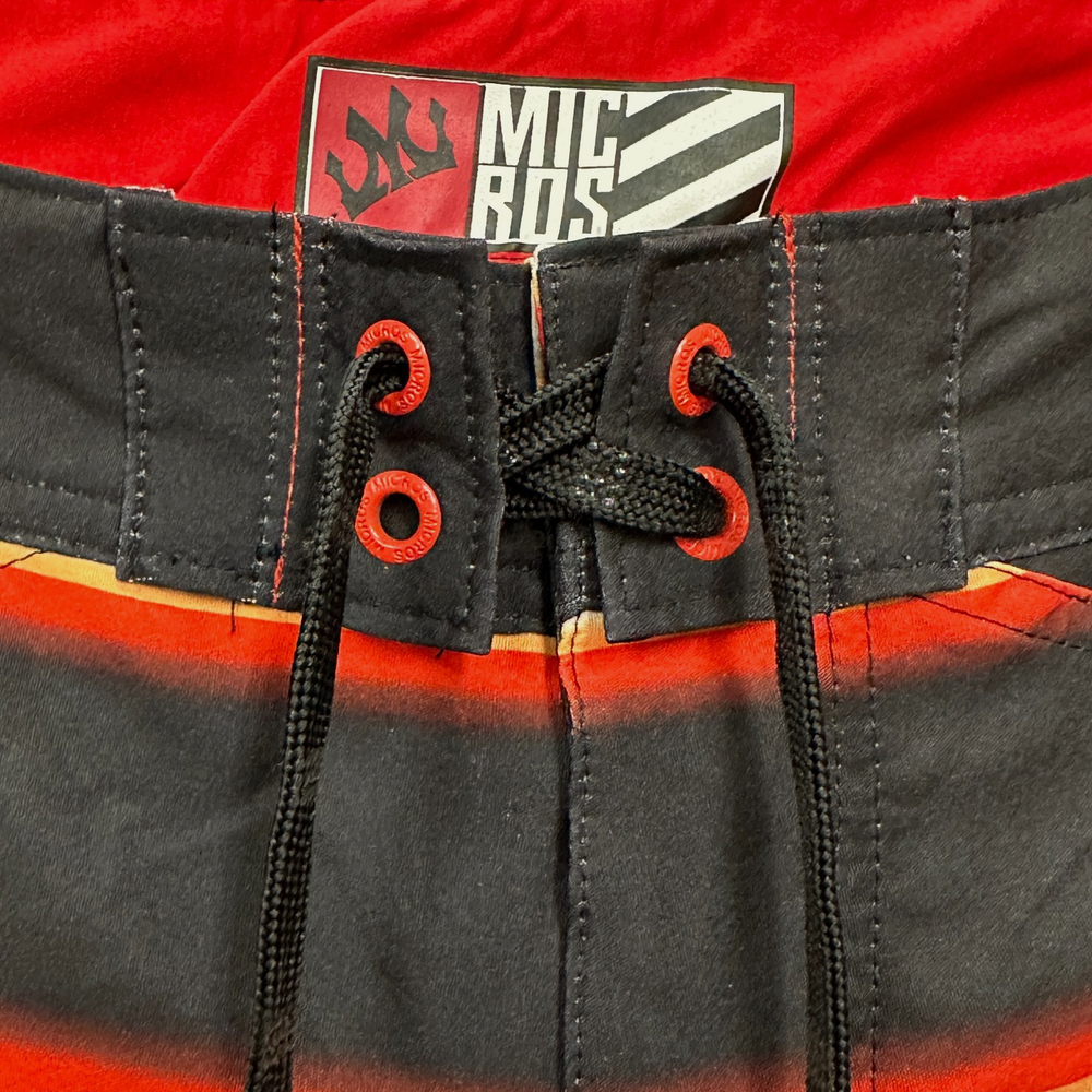 These New with Tags Micros board shorts for men in size 36 feature a bold red, yellow, and white stripes on black, making them a stylish choice for surfers and swimmers. Made from polyester, these board shorts are machine washable for easy care. The key loop in the pocket (with attached bottle opener) detail adds a practical touch, while the hook and loop fly with a lace-up waist ensure a secure fit while in the water. Perfect for beach days or surfing adventures, these board shorts from the brand MICROS are a must-have for any water sport enthusiast. Please review photo measurements carefully to ensure a good fit. Ships from a smoke free home.