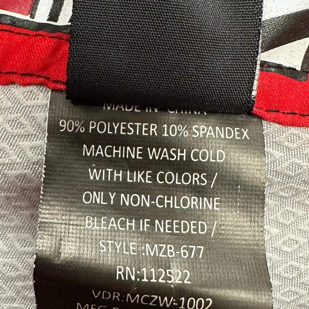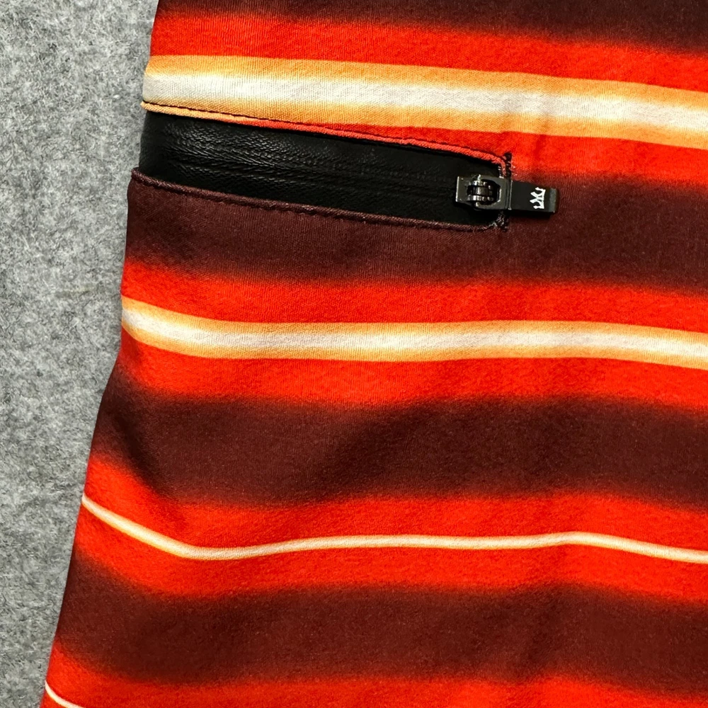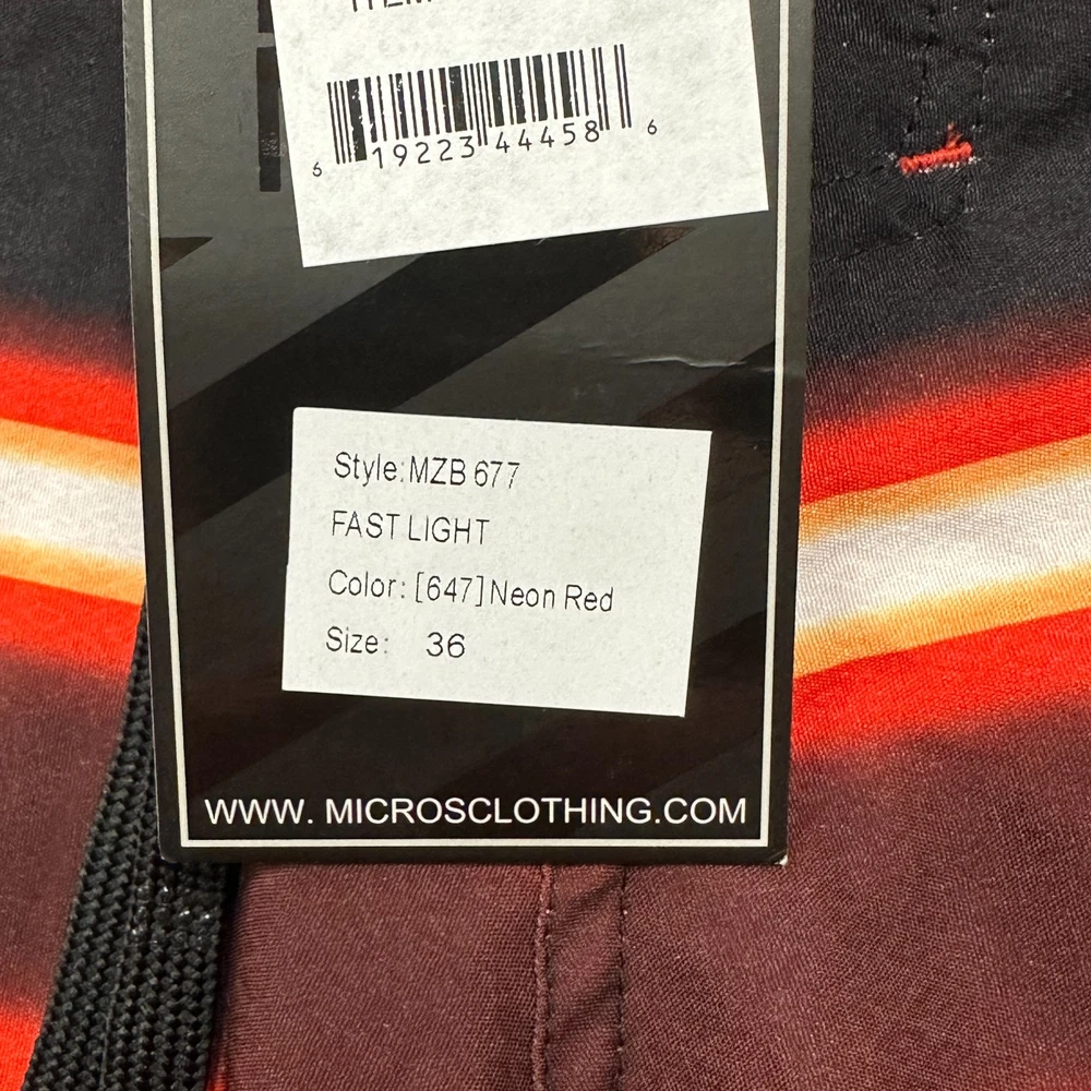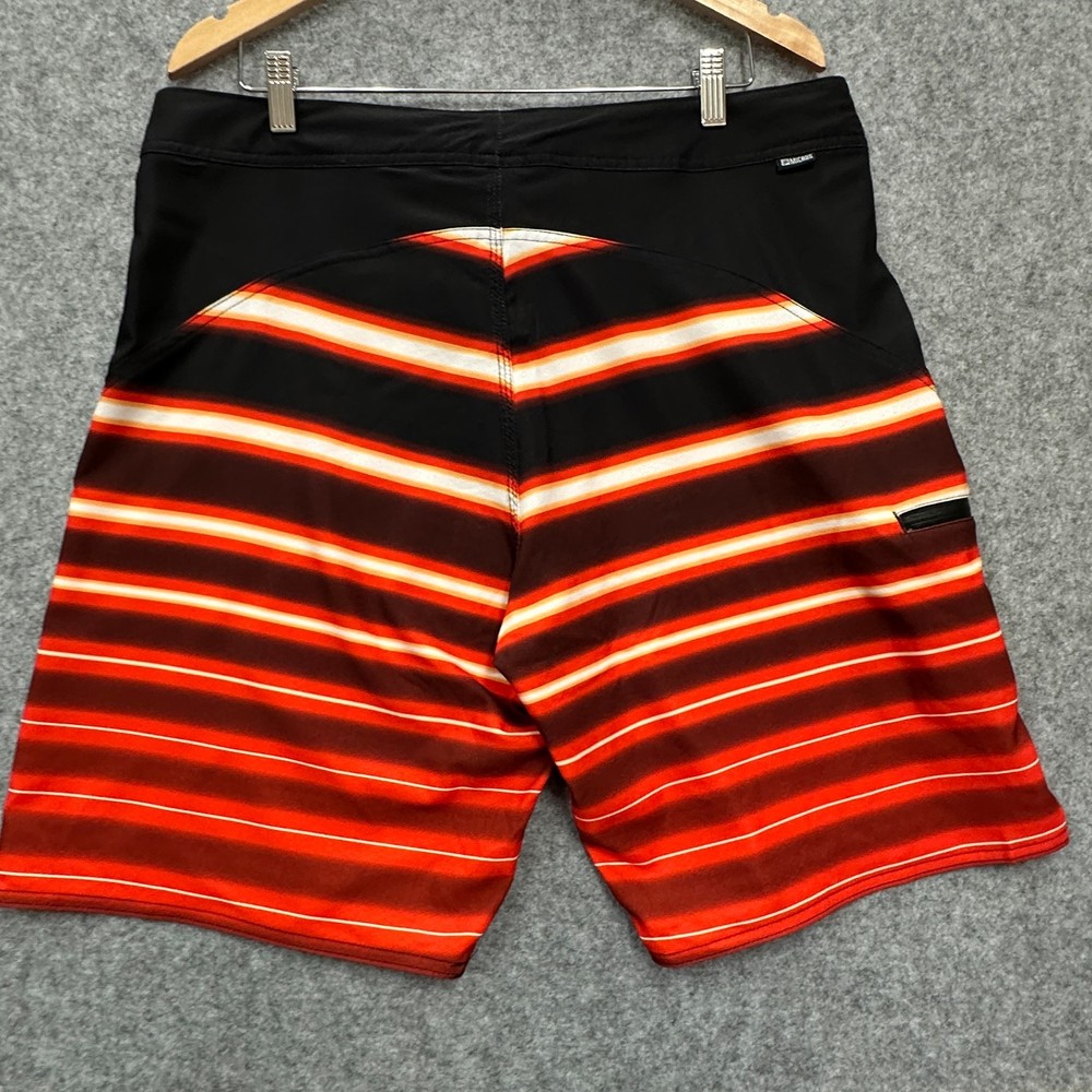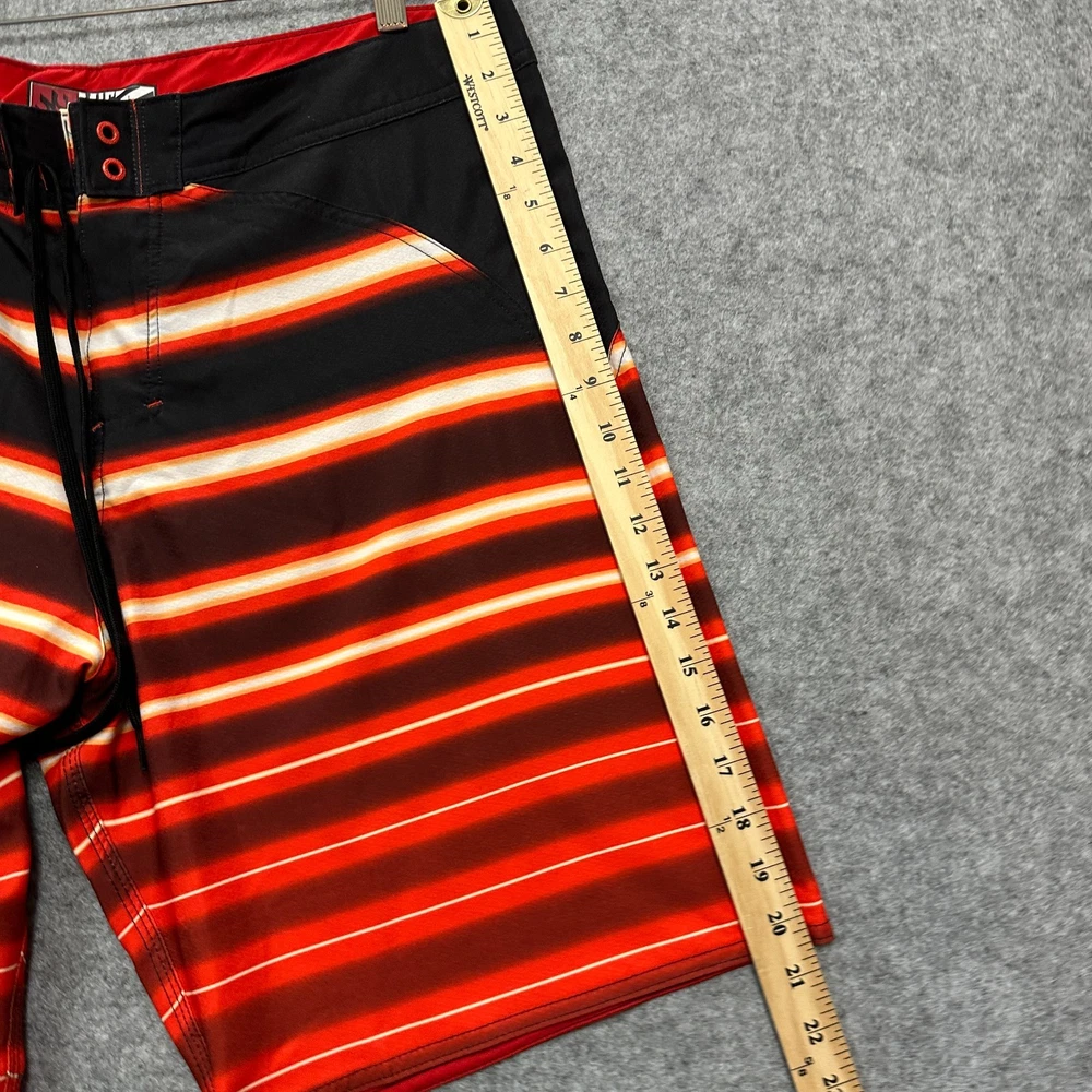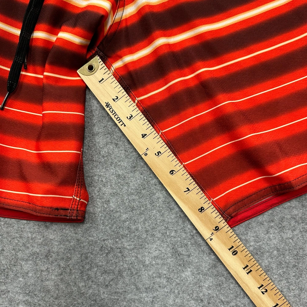These New with Tags Micros board shorts for men in size 36 feature a bold red, yellow, and white stripes on black, making them a stylish choice for surfers and swimmers. Made from polyester, these board shorts are machine washable for easy care. The key loop in the pocket (with attached bottle opener) detail adds a practical touch, while the hook and loop fly with a lace-up waist ensure a secure fit while in the water. Perfect for beach days or surfing adventures, these board shorts from the brand MICROS are a must-have for any water sport enthusiast. Please review photo measurements carefully to ensure a good fit. Ships from a smoke free home.
