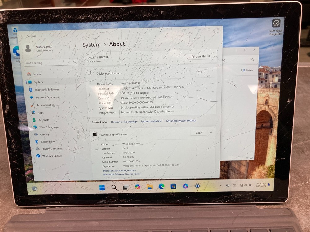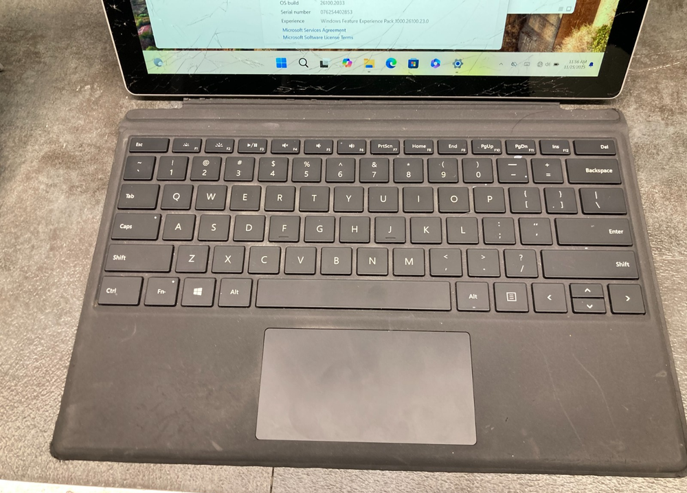 Microsoft Surface Pro 7 1866 Core i5-1035G4 8GB 128GB SSD 12.3" Touch Fully functional, however, screen is cracked. Still able to touch and swipe. LCD is still in very good condition. Windows 11 Pro fresh installed. *Keyboard is worn. Part of the magnetic on the keyboard is missing so the pins need to be align to the tablet to work. Intel Core i5-1035G4 8GB Memory 128GB SSD