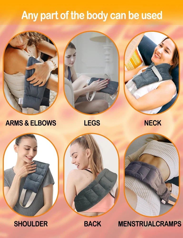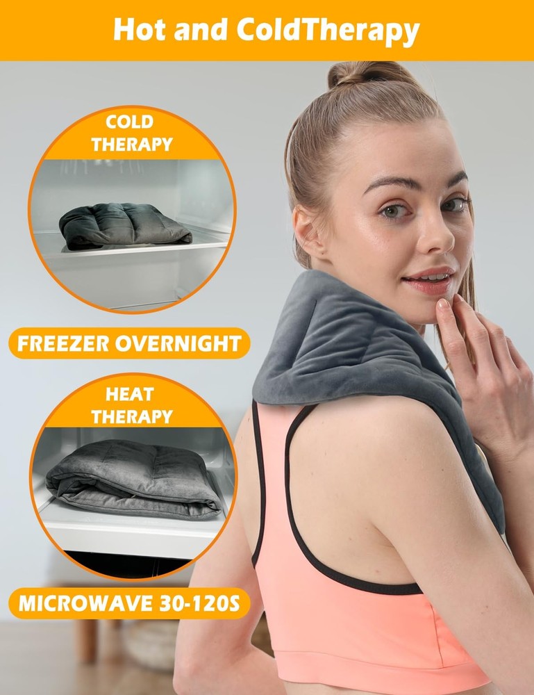 Kivdes Microwavable Heating Pads for Neck Shoulders Pain Relief 33*5.9" Heated Neck Wrap Warmer Microwave Pad Moist Heat for Cramps Back Joints Muscles Warm and Cold Compress Reusable with Handles QUICK PAIN RELIEF: The Neck Heating Pad helps relieve neck, shoulder and back pain. Heating it improves blood circulation while soothing stiffness and soreness. HOT & COLD THERAPY: Moist heat therapy effectively relieves joints, cramps, stiffness, muscle aches, tightness, arthritis, swelling and inflammation, providing deep, penetrating moist heat and improving blood circulation. Cold therapy provides a comfortable cooling sensation and reduces swelling from strains and sprains. No need to worry about medication side effects. EXTRA LONG & FLEXIBLE & MULTIPURPOSE: This microwave heating pad measures 33.44*5.9 inches,1.78LB, which can fit your neck, shoulders and back well. In addition, it is longer than most regular rice heating pads. This microwave heating pad is an amazing multi-purpose heat pack that is soft and flexible enough to fit your body parts and provide calming heat to your neck, shoulders, back, arms, legs, ankles and knees. SECTIONAL CHAMBER & ERGONOMIC DESIGN: Featuring a unique segmented chamber stitching, it helps to fit your body and provide more even and long-lasting heat, and it has two handles that are flexible enough to be applied to any part of your body, providing you with instant relief from aches and pains. 100% NATURAL FILLING & DURABLE: Our heating pads are filled with flaxseed,millet and clay beads, these natural ingredients have the effect of keeping you warm for a long period of time, no matter where you are, this heat pad will keep you warm and relax you. In addition, the heat neck cover is made of skin-friendly fabric. It can withstand high temperatures and retain heat. Durable enough to withstand frequent use. GREAT GIFT FOR HOLIDAYS: Our microwave heating pads, either on their own or in a value pack, make a beautiful gift for any occasion. Give someone you care about a gift that keeps on giving. Every time they use it to relieve neck, shoulder, lower back, knee pain or cramps, or if they want to feel comfortable, they'll know you care through our neck and shoulder heating pad.
