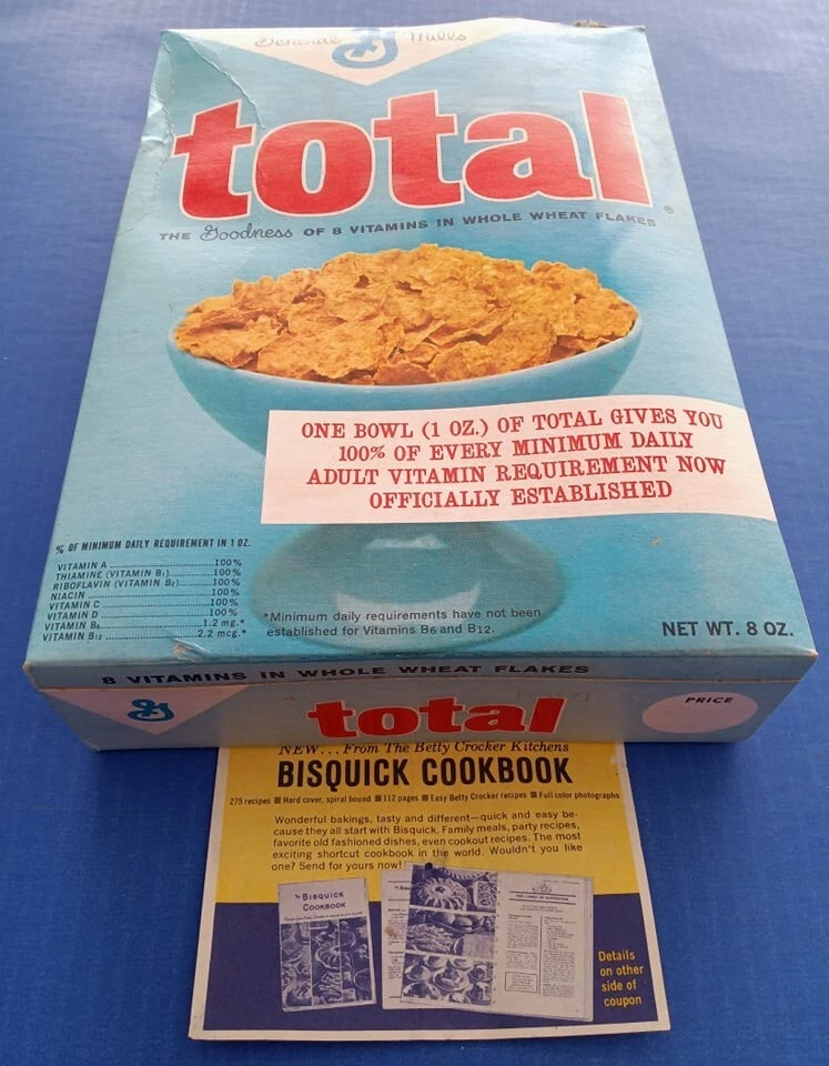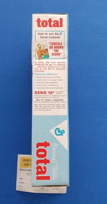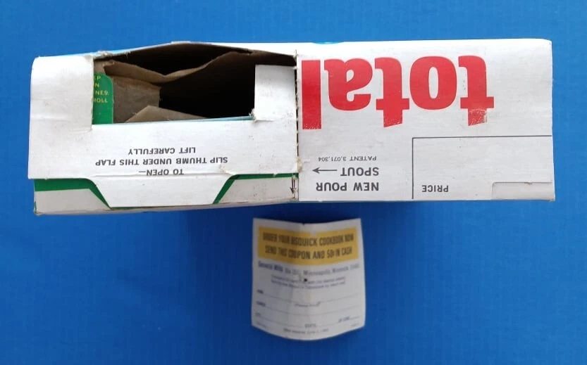 Mid 1960s (1964?) General Mills Total cereal box with Betty Crocker Bisquick cookbook coupon included! Tough to find box! Box is in average used condition, with a sealed bottom and a clipped Betty Crocker seal. See photos. US auction only. I can combine similar auction items to save on shipping! See my other auctions for more cool stuff!!!
