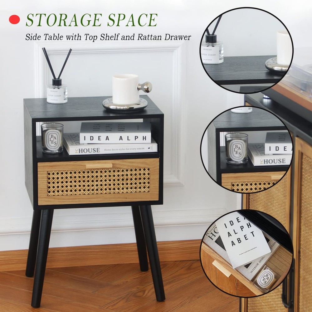 Side Table Modern Side Table The let's style meets functions with the bedside tabble. The nightstand characterized with durable frame and modern minimalist style to fit with any home decor and make the home looks snug and stylish. Widely Used Perfect as a side table, small nightstand for bedroom, end table at indoor and outdoor, such as living room, balcony, small space, and concern. Specification: Color: Black Material: MDF & Solid Wood Size: 11.8'' D x 15.7'' W x 23.6'' H Weight: Weight: 17.6lb/8kg FEATURES: Walnut Tabletop: Its smooth and walnut color surface, the side table is easy to clean and won’t be fade. Top shelf : The unique top shelf offers more space to hold essential items, such as books, plants. Rattan Drawer : The rattan drawer with handmade weaving technology, delivering elegant apparent effection add snugging to your home and offer large storage space. Convenient End Table: The mid century nightstand design with light-weight and compact size can be easily and conveniently moved to any place you want. And easy to assemble. Stylish and Practical Storage: The bedside table features a two-tier storage design, a unique extra top shelf and a spacious tabletop with a natural rattan drawer to fit your snug home and provide more space to put down books, snacks, drinks Easy to assemble: The nightstand's instruction is easy to read, the process of assembling is simple and easy to follow with detailed steps. When installing the screws, Do not use Electric Screwdriver, Please screw it by manually and be carefully Sturdy Side Table: The solid wood legs, elegant square tabletop, walnut colour surface and natural rattan constituted this mid century nightstand. It is ready to hold everything you need with easy reach. Ideal as a sofa table, corner table, nightstand, coffee table, bedside table, laptop desk, lamp table for your living room, bedroom, hallway, or office Premium Material: The sturdy solid wood and premium density board of this accent table ensure years of use and long-term stability; low-impact coating keeps the nightstand looking artistic for long time use and easy to clean Specifications: The overall dimensions of the modern nightstand: 11.8''D x 15.7''W x 23.6''H. The rattan drawer dimensions: 9.4''D x14''W x 4.7''H. If you have any problem, do not to hesitate to reach out to us. team offer 24-hours after-sales service, we are aimed to provide a wonderful shopping experience