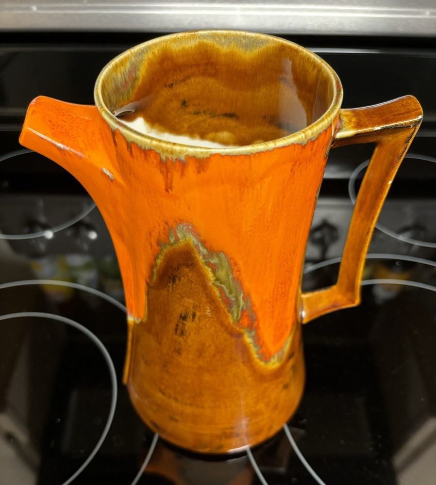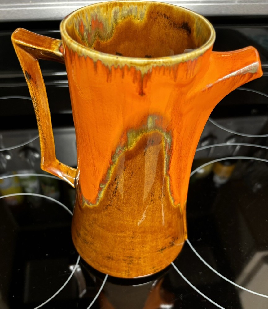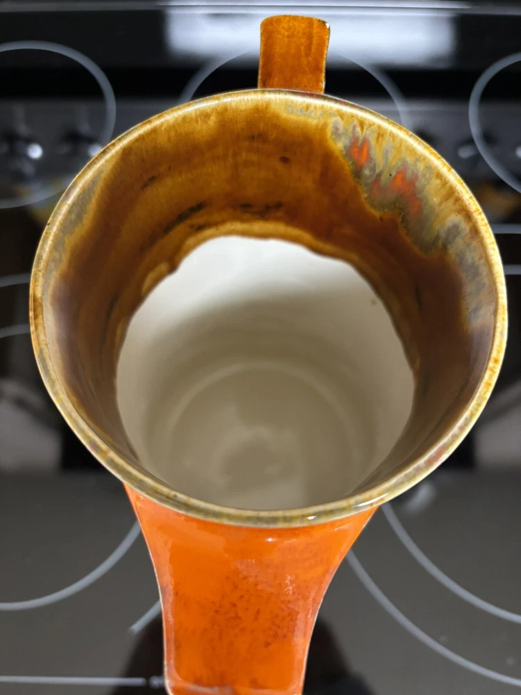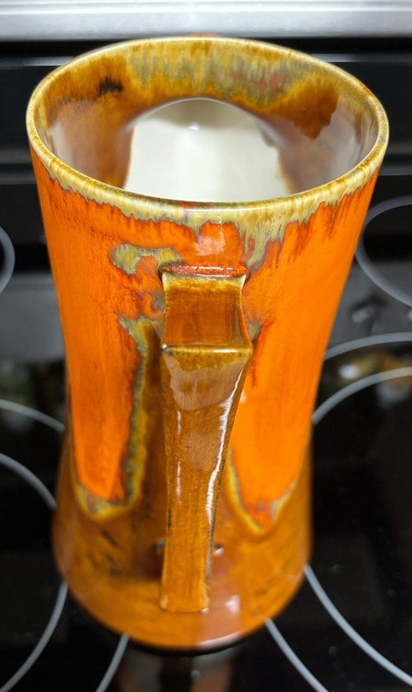Elevate your home decor with this mid-century modern drip pitcher and pedestal mugs set. The brown and orange color combination, along with the footed pedestal design, adds a touch of vintage charm to any occasion. The glossy finish and art pottery production style make this set a unique and original addition to your collection. The unmarked brand and country of manufacture add to the mystery and allure of this set, while the three-footed pedestal mugs provide a sturdy and stylish way to enjoy your favorite beverage. Whether you're hosting a dinner party or enjoying a quiet evening at home, this ceramic set is sure to impress. Small chip on bottom of one of the mugs, see pictures. Pitcher is 9.25” high.