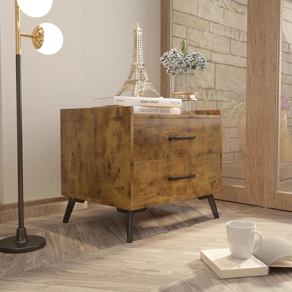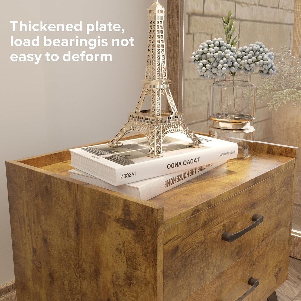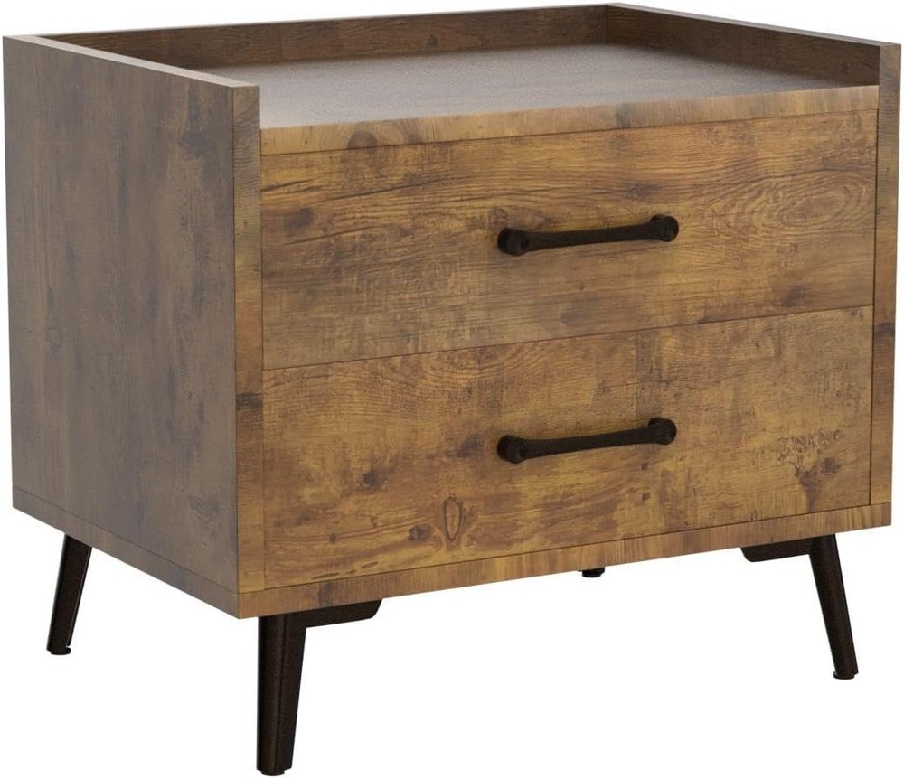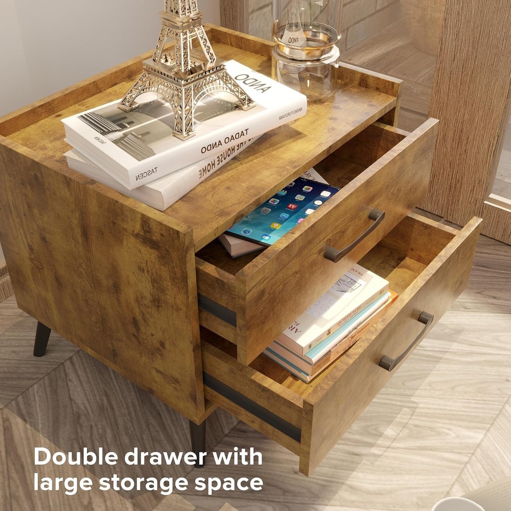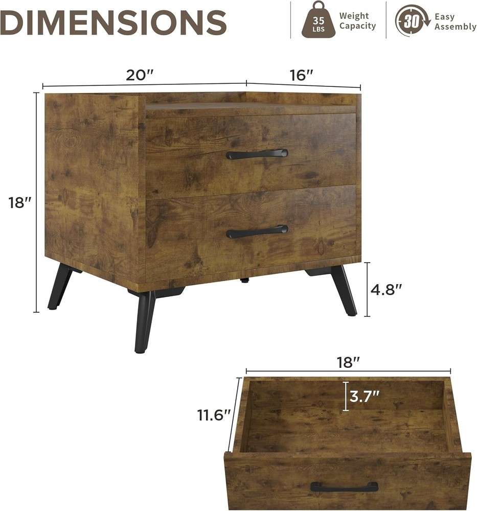 Brown Nightstand with 2 Drawers, Mid Century Modern Bedside Tables, Product Details Brand: Lonkwa Product Dimensions: 20"D x 16"W x 18"H Maximum Weight Recommendation: 15.88 Kilograms Color: Brown Recommended Uses For Product: Bedroom, Living Room, Study Room Item WeightFrame Material: 28.6 PoundsWood Top Material TypeShape: Engineered WoodRectangular Modern Design: Featuring clean lines and a smooth wood look, this nightstand offers the look, feel, and design of a truly contemporary piece. With a minimalistic yet refined structure, this end table brings out a simplistic style that emphasizes convenience and functionality. Durable & Stable: Constructed with premium manufactured wood and exquisite workmanship make this side table built to last and can withstand the wear and tear of daily use. Smoothly running drawers on metal glides with built-in safety stops, not afraid of long-term use. Sufficient Storage Space: Bedside Table assembled size: 20"L x 16"W x 18"H. Equipped with 2 Large Drawers, perfect for bedside storage, keeping your favorite books, cups, CDs and anything else on the spacious desktop, odds and ends in drawers. let this bedside tables give you a well-organized night. Versatility: Lonkwa nightstand is not just limited to use in the bedroom. The space-saving design and neutral color will blend well with any furniture, It can be used as a side table or an end table in the living room or study room, which makes it a perfect addition to any home. Easy Assembly: Crafted for convenient shipment and easy assembly. All parts are marked with either a letter or a number, and the instructions show exactly which parts should be used. You just need to follow the steps install the nightstands. You can assemble easily within 30 minutes.