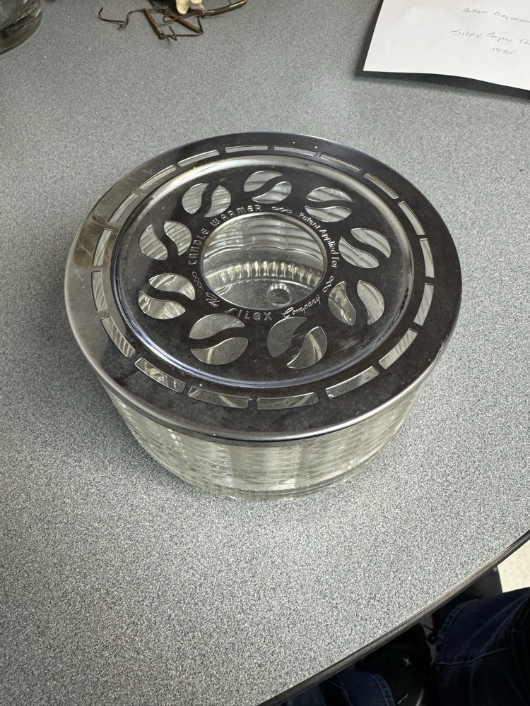 The image shows a vintage Silex Company candle warmer, likely from the 1940s. It was designed to keep coffee or tea carafes warm. It features a ribbed glass base and a chrome lid with ventilation holes. The top of the lid has the inscription "SILEX Company" and "Patent Applied For." It uses a candle to generate heat. Designed by Peter Muller-Munk. It is considered a Mid-Century Modern piece.