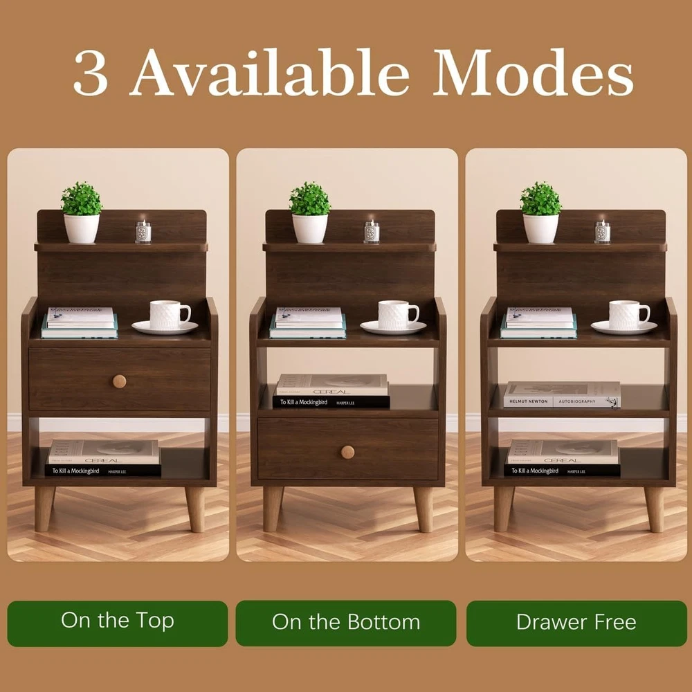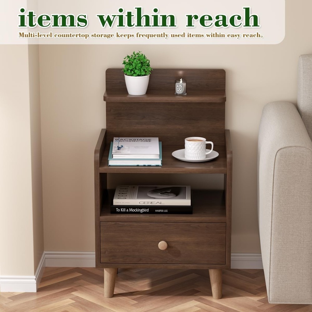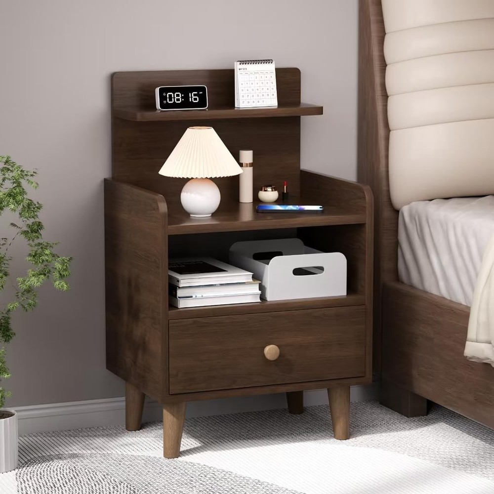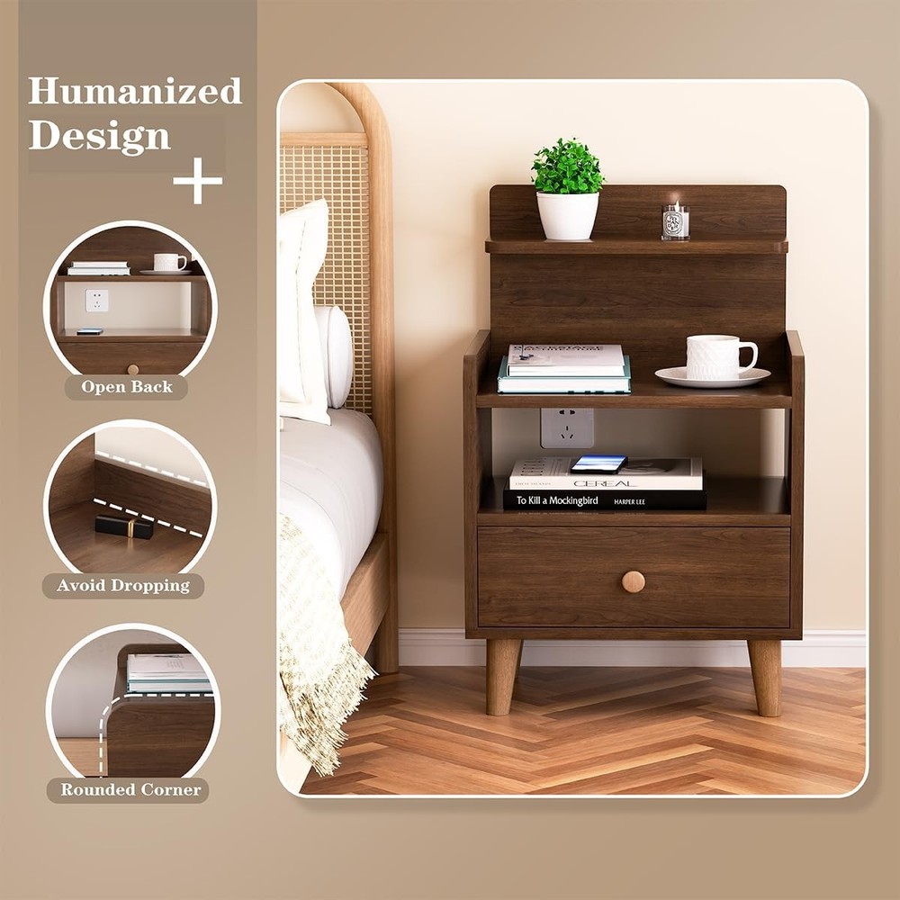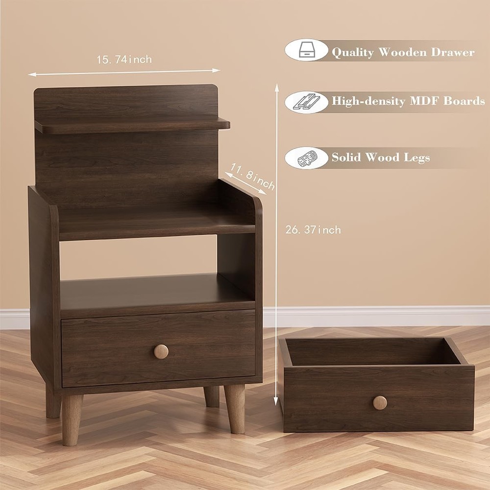 Night Stand, Wood Bedside Tables with Drawers, Mid Century Modern Side Walnut Product Details Brand: VOVUVK Product Dimensions: 11.8"D x 15.74"W x 26.37"H Maximum Weight Recommendation: 30 Pounds Color: Walnut Table design: Nightstand Item WeightFrame Material: 16 PoundsWood Top Material TypeShape: WoodRectangular 【Multi-tiers storage】Countertop storage space allows common items to be within reach, It has a tiered design including countertop area, open area and drawer area. This design makes storage orderly and convenient. Whether it is to place books, mobile phones, glasses and other daily items, or to store some personal items, this nightstand can easily cope. 【Humanized Design】 This bedside table features an open back, allowing you to charge your devices without obstruction. Its spacious multi-tiered surface provides easy access to your frequently used items, and the side guardrail adds height to prevent small items from falling off. The corners are rounded to avoid possible damage 【Sturdy and durable】our night stand is Crafted with high-density MDF boards board, features a wear-resistant surface for long-lasting beauty and functionality. High solid wood cabinet legs, stable bearing is not easy to shake. Thickened sheet, stable and resistant to shaking, making it a reliable choice for your home. 【Freely placed drawer】The drawers of this night stand can be pulled out and placed on the upper or lower layer to meet your needs. The open shelf can be used to place more frequently used items. Most importantly, our drawers are made of board material, which is more durable than fabric drawers. 【Multiple Use Occasions】serving as a nightstand, side table, end table, and more, it's a perfect addition to your bedroom, living room, or any space you desire 【Easy to Assemble】The package includes detailed instructions and accessories, It can be assemble in a short time without the help of professionals. ensure you have a satisfactory experience during the purchase and use process, our customer service team will be on standby to provide professional answers and solutions.