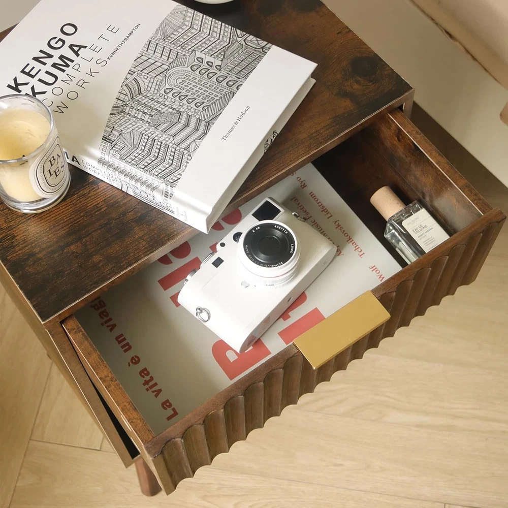 Mid Century Modern Nightstand, Wood Bedside Table with Drawer Rustic Brown Product Details Brand: Fultyle Product Dimensions: 11.8"D x 15.7"W x 24.4"H Color: Rustic Brown Shape: Rectangular Table design: Nightstand Frame MaterialTop Material Type: Engineered Wood, WoodEngineered Wood Spacious Storage Space: This nightstand is designed for the home organizer, with a drawer and a large opening storage space, providing roomy storage space for books, fruit, plants, and essential items. Also, the roomy modern nightstand tabletop is a nice choice for displaying photo frame, cup, lamp or alarm clock Superior Quality: This modern nightstand is made from high-density MDF boards and solid wood legs. The four legs of bedside table are designed to be slanted instead of vertical, which provides more area to prevent sliding and tilting, and ensures durability and stability for long-term use Chic Fluted Nightstand: The charming walnut grain, smooth surface, metal handle, and curved drawer create this mid century modern nightstand. The fluted drawer is corrugated, which makes this wood bedside table more unique and stylish, while the metal drawer handle matches natural legs, and exudes a vibe of elegance Multipurpose Nightstand: The demensions of the nightstand: 11.8''D×15.7''W×24.4''H. This bedside table with curved drawer provides a pefect size to match any variety of furniture. It is pefect as a coffee table, bedside table, end table, sofa side table living room and nightstand for bedroom Easy to Assemble: This nightstand comes with detailed instrution, clear marks and all the necessary parts, ensuring fast and effortless assembly. Quickly, you will get a stylish and practical nightstand at your home. If you have any issues, please don't hesitate to reach out to us – we're here to assist you every step of the way