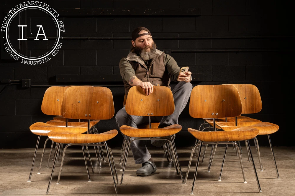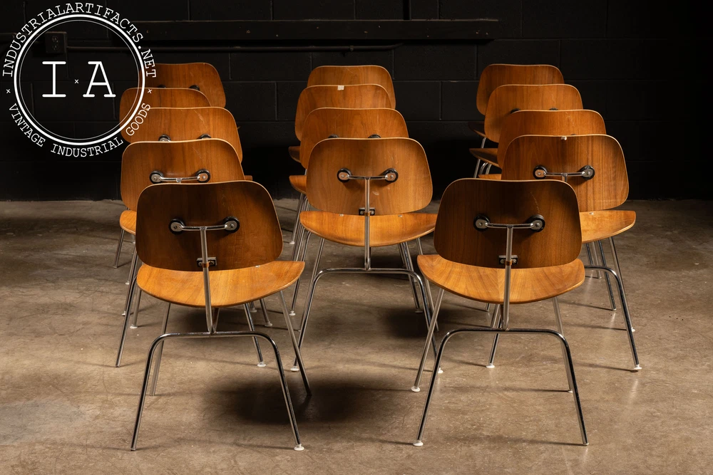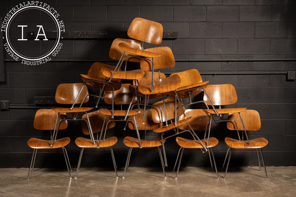 c. 1940s - 1950s; Herman Miller Inc. - Zeeland, MI Nutwood and chrome DCM (Dining Chair Metal) dining chair designed by Charles and Ray Eames in 1946 for Herman Miller. This iconic chair features the classic mid-century look people have come to associate with Eames. It features a molded walnut veneer supported by a polished chrome frame. These chairs all have some measure of damage, including holes through the seats, holes through the back rests, additional supports added, missing feet glide components, as well as other miscellaneous damage. All chairs are sold as is. Listed individually, but please contact us to buy the full set (15). 20.5" W x 20.5" D x 29.5" H Seat: 17" H Please refer to photos regarding condition. For more info regarding delivery of your order, please review our shipping Terms and Conditions. MM - 6626 - 121423 TERMS & CONDITIONS PARCEL SHIPPING We offer free shipping to the continental US on smaller items. All parcel packages are fully insured and shipped through USPS or UPS. FREIGHT SHIPPING NOTE: All shipments are considered Free on Board (FOB), meaning the buyer assumes all responsibility for the shipment the moment it leaves our loading dock. Any damages or loss that may occur after this point are the buyer's responsibility. In the event of damage or loss, we are happy to assist buyers in the claims process if we helped coordinate the shipment. However, we are not responsible for any damages, loss, or deductibles. Free freight shipping to a terminal is available for most large items (some terms apply). Free shipping is only offered to orders in the continental US. Our shop also works with a number of private drivers, and we are happy to assist buyers in finding private shipping for their order if desired. Please reach out to us for more information about your shipping options. A 2 - 4 week period is to be expected for freight delivery. Packaging your freight safely and contracting with the most valuable broker is our highest priority in order to save you money and time. Please provide a phone number for our shipping carriers to contact you regarding delivery or pickup. This is required after purchase. INTERNATIONAL CUSTOMERS Due to the high value of some of our items, many items shipped internationally cannot always be insured for their full value. In these cases, we will insure them to the full extent available, but will not be responsible for additional damages above the available insured amount. International items are shipped via USPS or UPS; please become familiar with the insurance policy associated with your country. BUYERS ARE RESPONSIBLE FOR ANY DUTIES AND TAXES THAT MAY APPLY. OTHER Our items may contain rust, dust, grease, or grit. All of our pieces are reclaimed from industrial environments where they may have been exposed to years of use and weathering. As such, each piece has character. Industrial Artifacts cannot be held responsible for matters of taste regarding the character of a piece. Bulbs for light fixtures are not included unless specified. Returns: Returns are not accepted. Refunds: A 10% restocking fee will be applied to refunded purchases wherein the buyer no longer wishes to complete the transaction. Please refer to photos regarding condition. For more info regarding delivery of your order, please review our shipping Terms and Conditions. MM - 6626 - 121423 TERMS & CONDITIONS PARCEL SHIPPING We offer free shipping to the continental US on smaller items. All parcel packages are fully insured and shipped through USPS or UPS. FREIGHT SHIPPING NOTE: All shipments are considered Free on Board (FOB), meaning the buyer assumes all responsibility for the shipment the moment it leaves our loading dock. Any damages or loss that may occur after this point are the buyer's responsibility. In the event of damage or loss, we are happy to assist buyers in the claims process if we helped coordinate the shipment. However, we are not responsible for any damages, loss, or deductibles. Free freight shipping to a terminal is available for most large items (some terms apply). Free shipping is only offered to orders in the continental US. Our shop also works with a number of private drivers, and we are happy to assist buyers in finding private shipping for their order if desired. Please reach out to us for more information about your shipping options. A 2 - 4 week period is to be expected for freight delivery. Packaging your freight safely and contracting with the most valuable broker is our highest priority in order to save you money and time. Please provide a phone number for our shipping carriers to contact you regarding delivery or pickup. This is required after purchase. INTERNATIONAL CUSTOMERS Due to the high value of some of our items, many items shipped internationally cannot always be insured for their full value. In these cases, we will insure them to the full extent available, but will not be responsible for additional damages above the available insured amount. International items are shipped via USPS or UPS; please become familiar with the insurance policy associated with your country. BUYERS ARE RESPONSIBLE FOR ANY DUTIES AND TAXES THAT MAY APPLY. OTHER Our items may contain rust, dust, grease, or grit. All of our pieces are reclaimed from industrial environments where they may have been exposed to years of use and weathering. As such, each piece has character. Industrial Artifacts cannot be held responsible for matters of taste regarding the character of a piece. Bulbs for light fixtures are not included unless specified. Returns: Returns are not accepted. Refunds: A 10% restocking fee will be applied to refunded purchases wherein the buyer no longer wishes to complete the transaction.