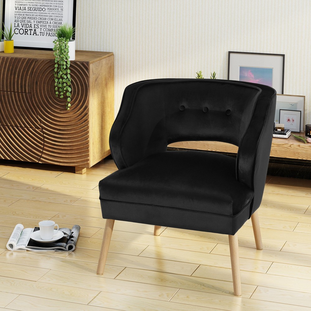 This mid century velvet accent chair is a wonderful addition to any room in your home. Featuring soft to touch velvet with rubberwood legs, this chair is exceedingly comfortable. With a complimentary button and ribbed design to the chair, it is very stylish and sure to match any decor. Place this chair in your living room as extra seating, in the entry way for a quick seat to put your shoes on before leave, or any room you in your home. You are sure to love this chair for years to come.Includes: One (1) Accent ChairMaterial: Polyester Velvet, RubberwoodColor: Teal, Black, Chocolate, Emerald, Grey, or Lavender Leg Finish: NaturalLight Assembly RequiredHand Crafted DetailsDimensions: 30 inches high x 27.25 inches wide x 27 inches deep Assembly Required Free Shipping Over $49.99* Details Mariposa Mid-century Velvet Accent Chair by Christopher Knight Home Product Description: This mid century velvet accent chair is a wonderful addition to any room in your home. Featuring soft to touch velvet with rubberwood legs, this chair is exceedingly comfortable. With a complimentary button and ribbed design to the chair, it is very stylish and sure to match any decor. Place this chair in your living room as extra seating, in the entry way for a quick seat to put your shoes on before leave, or any room you in your home. You are sure to love this chair for years to come. IncludesOne (1) Accent Chair MaterialPolyester Velvet, Rubberwood ColorTeal, Black, Chocolate, Emerald, Grey, or Lavender Leg FinishNatural Light Assembly Required Hand Crafted Details Dimensions30 inches high x 27.25 inches wide x 27 inches deep Assembly Required