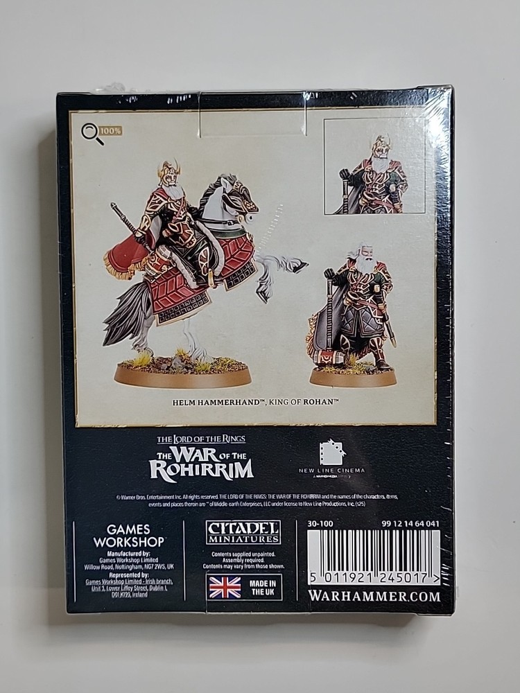 The product is a single miniatures from Games Workshop, depicting Helm Hammerhand, King of Rohan from Middle-Earth, for use in Warhammer 40K game play. Made in the United Kingdom, this unassembled and unpainted figure is part of the Middle-Earth army collection, perfect for fans of the Lord of the Rings franchise looking to enhance their gaming experience with detailed and high-quality miniatures.