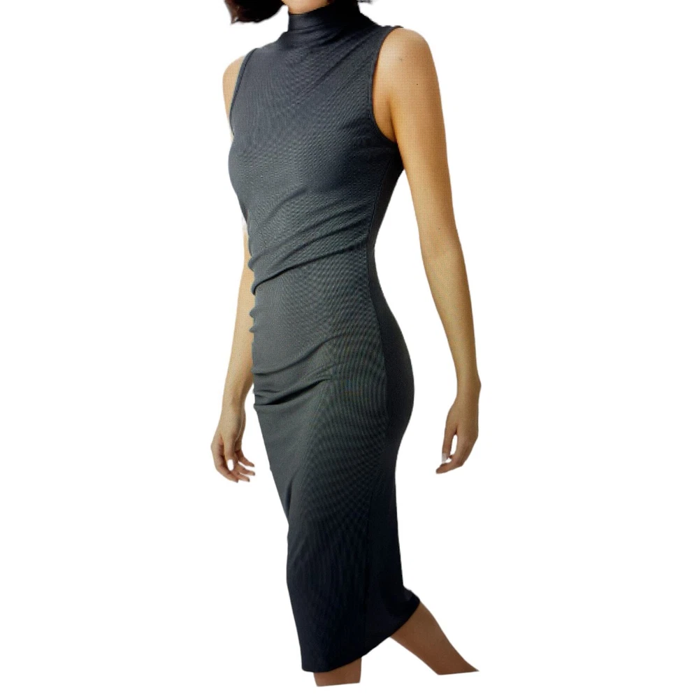 Elevate your wardrobe with this stunning gray midi dress from Cider. The high neck and side ruched accents add a touch of elegance to the bodycon fit, making it perfect for any occasion from weddings to cocktail parties. The dress is made from a stretchy 96% polyester and 4% elastane fabric, ensuring comfort and a flattering fit. This dress is perfect for the fashion-forward woman who wants to make a statement without sacrificing comfort. It's machine washable and easy to care for, making it a great addition to any wardrobe. Don't miss out on this stylish and versatile piece! Length 48.9 inches PTP 17 lying flat across approximately #RibbedKnitDress #MidiDress #HighNeck #Bodycon #GrayDress #All seasons #StretchDress #SleevelessDress