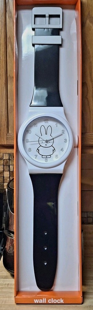 This NEW Miffy White Rabbit Huge White Black Wristwatch Wall Clock is a whimsical and charming addition to any room in your home. Measuring 36 inches in length, this battery-operated quartz clock features a white face with a large black wristwatch-style design. The clock is perfect for rooms like the kitchen, bedroom, living room, home office/study, hallway, or dining room. With its silent sweep feature and 12-hour display, this clock is not only functional but also adds a touch of art and nostalgia to your space with its Miffy & Friends theme. The white plastic frame and charming style make it a delightful choice for any home décor.