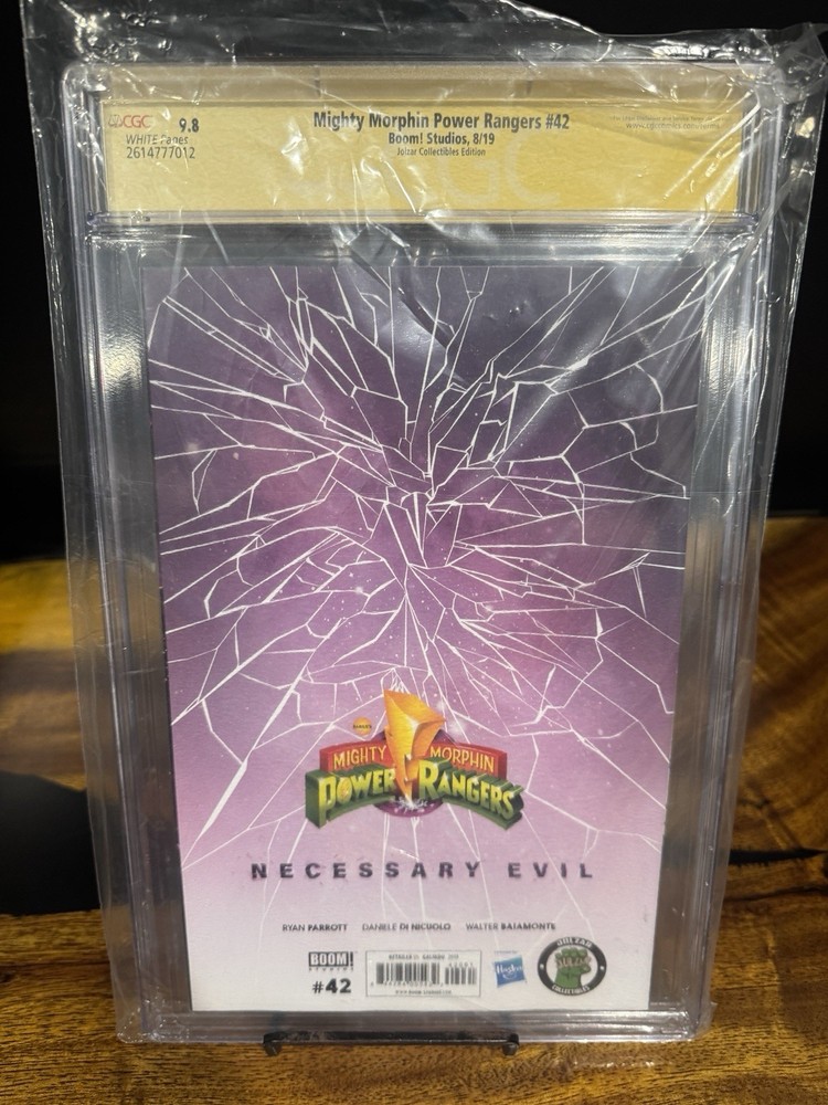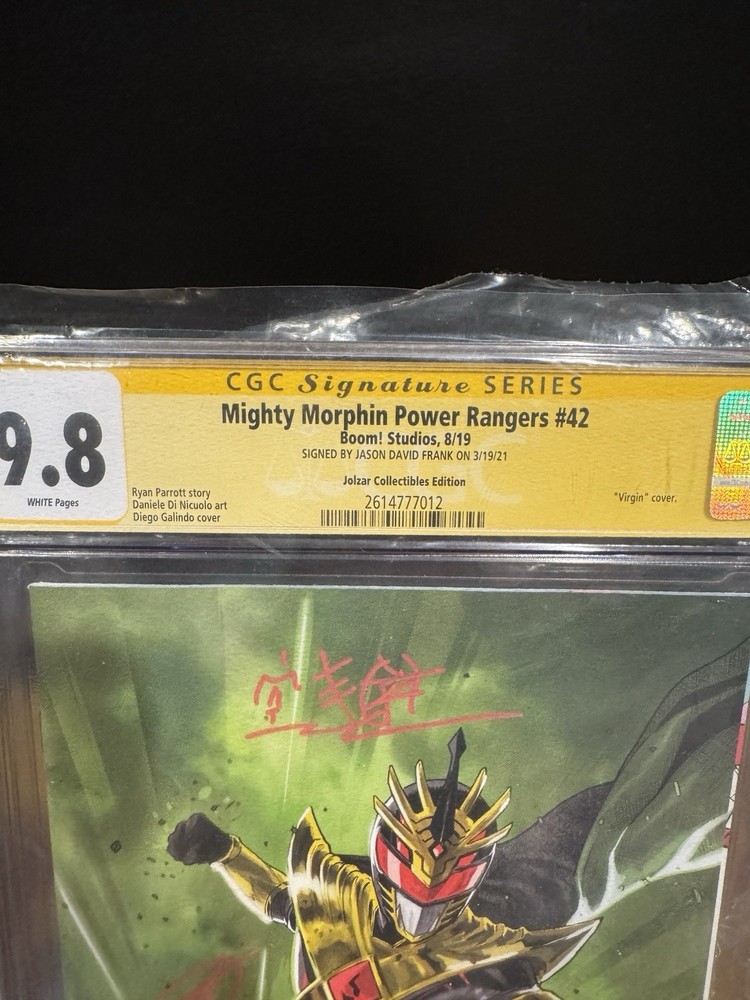 The product is a collectible comic book, Mighty Morphin Power Rangers #42, signed by Jason David Frank. This specific issue features the character Jason, who is part of the popular US Comics series. The comic is graded CGC 9.8, indicating high quality and authenticity. Fans of the Mighty Morphin Power Rangers series, especially those who appreciate the character Jason, would find this signed comic to be a valuable addition to their collection.