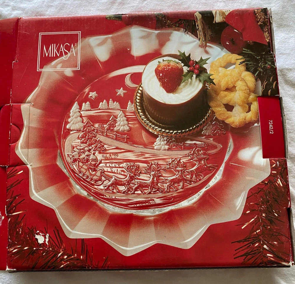 Add a touch of festive charm to your holiday table with this Mikasa Frosted Crystal Plate Platter. Featuring a round shape and a clear crystal material, this large platter is perfect for showcasing your Christmas decor. The intricate design showcases a Santa sleigh with reindeer, making it a perfect addition to your holiday collection. Crafted in Japan, this contemporary style platter is part of the Seasons collection and is perfect for adults. The frosted finish adds a unique touch to the platter, making it a great conversation starter. Whether you're using it to serve your favorite holiday meal or as a decorative piece, this Mikasa platter is sure to impress.