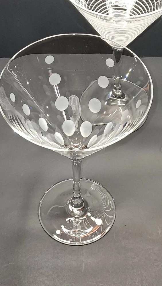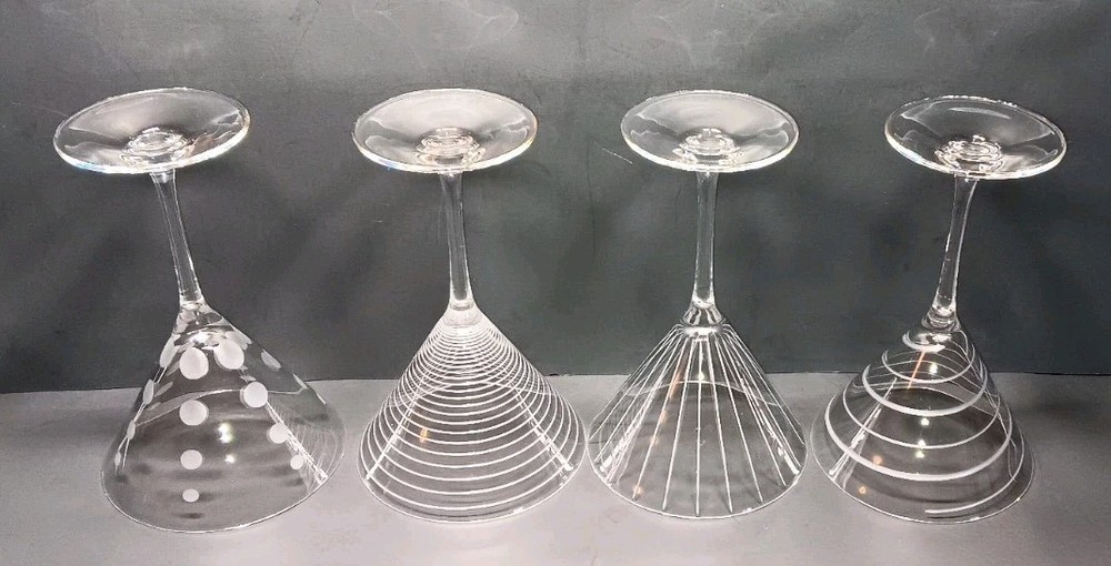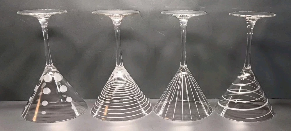 Elevate your martini experience with these exquisite Mikasa Cheers martini glasses. Handcrafted in 2003, these four-piece glasses boast a contemporary style with elegant glass production techniques. The clear, glossy finish and etched patterns make them perfect for any occasion. Each glass has a capacity of 8 ozs. and stands at 7 3/8" tall. The unisex design and hand-blown production style add to their uniqueness. The multimotif, cut lines, dots, and rings feature makes them a perfect addition to your drinkware collection. Hand wash only to maintain their exquisite design. This is a great set of used cut glasses by Mikasa. They are used and do have some minor scratches from previous use. No chips, cracks, or breaks of anykind. If you have any questions or concerns please feel free to contact me thanks.