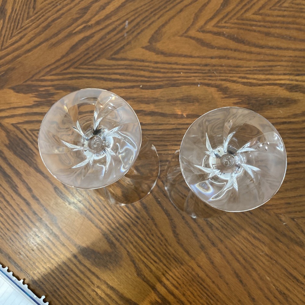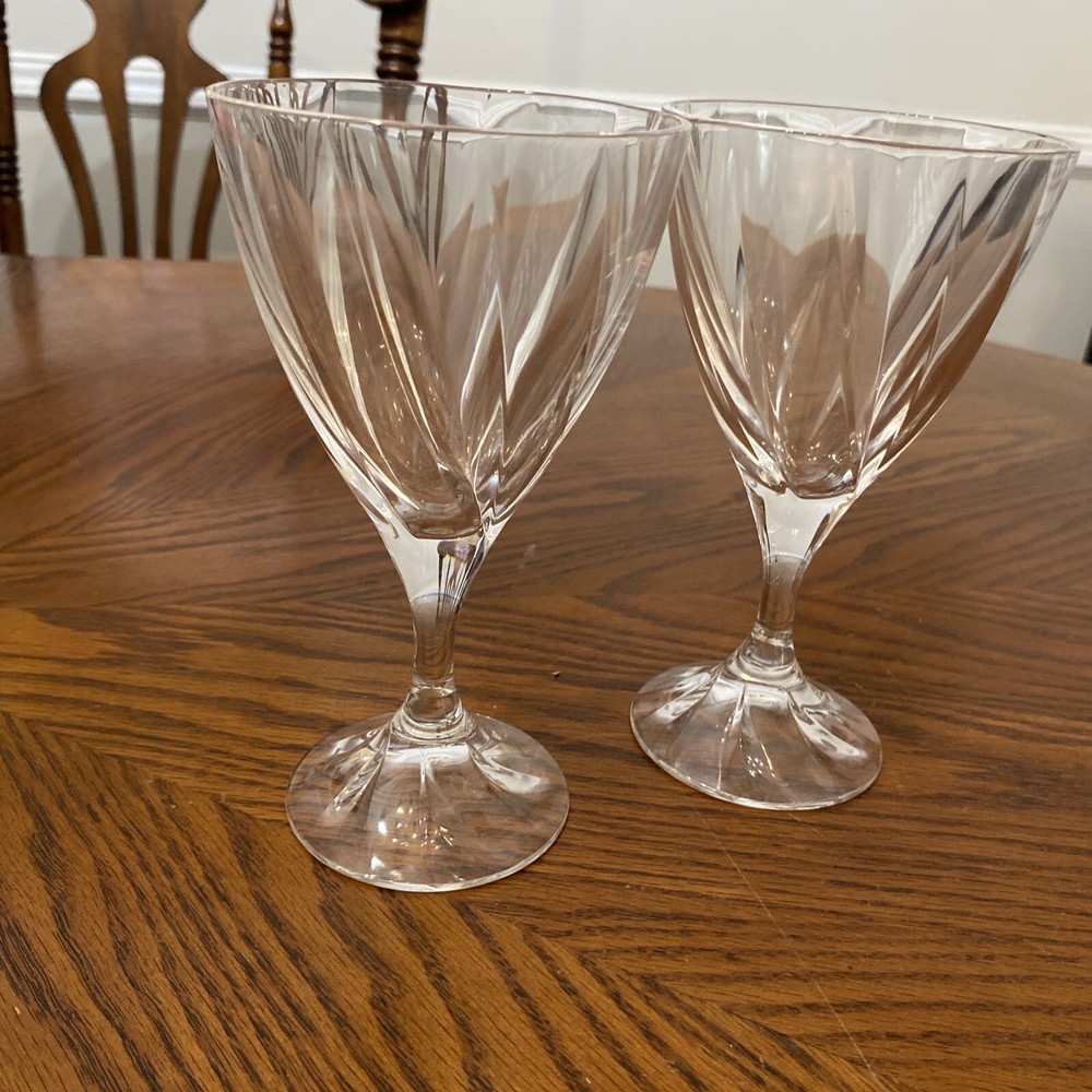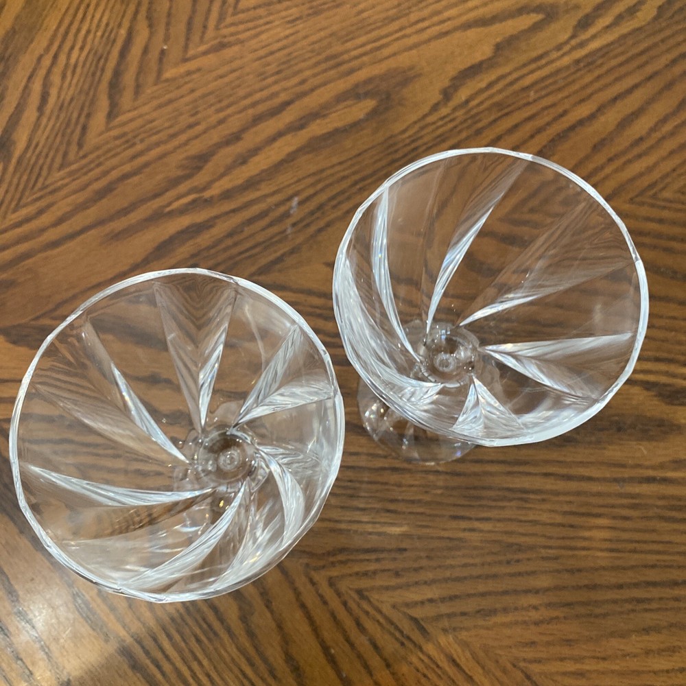 Elevate your drinking experience with this exquisite set of two Mikasa Impression Swirl Optic Crystal wine goblets. These goblets feature a stunning contemporary design with an elegant glass production style. The clear crystal material is beautifully crafted into a swirl pattern, adding a touch of sophistication to any table setting. Perfect for both men and women, these 6oz goblets are ideal for wine enthusiasts who appreciate the finer things in life. The backstamp is impressed with the Swirl product line, and the production technique is fused glass. These goblets are an original, licensed reproduction from the 1980-1989 time period. Add a touch of class to your drinkware collection with these Mikasa goblets. No cracks or chips. 6.75” wide x 3.75 wide at top. Purto
