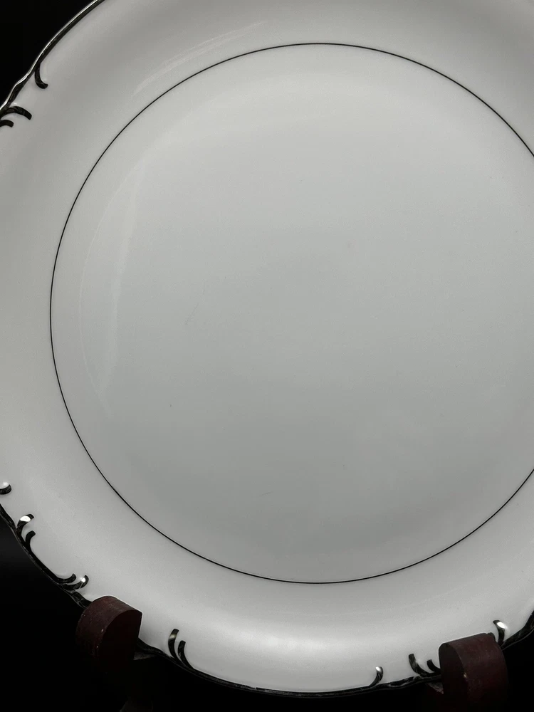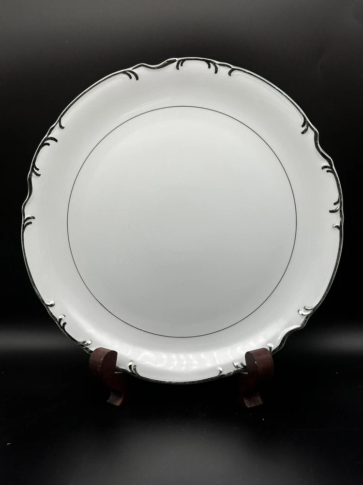 For sale pre-owned and vintage chop plate made by Mikasa in the 1970s in Japan. This bone china chop plate has a glossy white background featuring platinum trim and verge on the scalloped rim. This patter has been discontinued. Details: 12 inches diameter 1 1/8 inches high 2 pounds 5 ounces weight