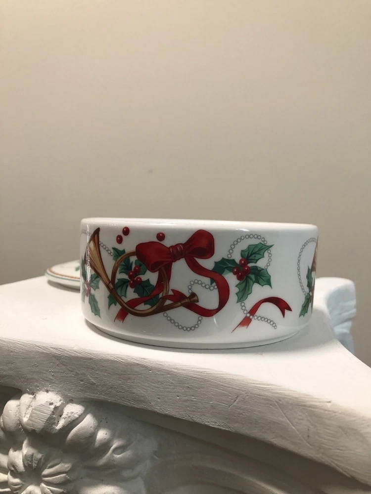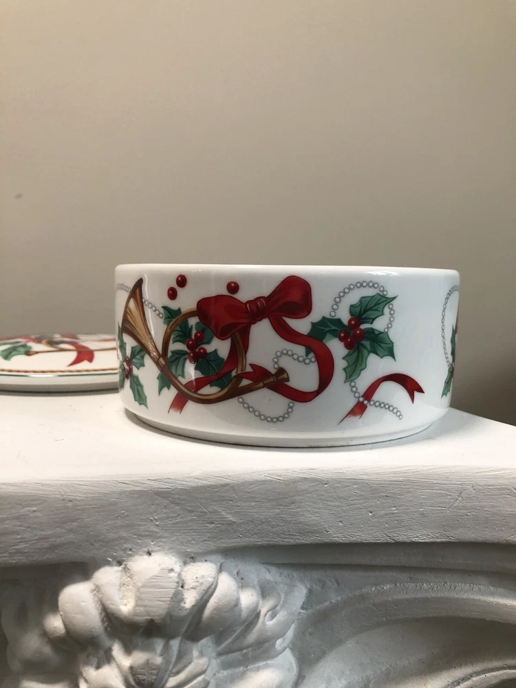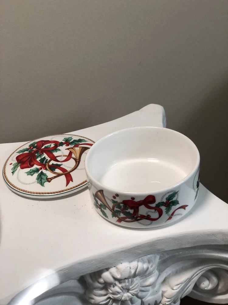 Add a touch of elegance to your collection with this Mikasa Maxima Round Trinket Box. The porcelain dish features a beautiful Holly Berry Ribbon Jubilation Trumpet pattern that is perfect for all occasions. The two-piece set is made in Japan and is an original production style of art pottery. Measuring 2 inches in height and 4 5/8 inches in width, this trinket dish is perfect for storing small items and serving as a decorative piece. The multicolor design is sure to catch the eye of anyone who sees it. This item is a great addition to any collection and is sure to impress. This item is in like new condition and has no chips, cracks or other signs of use.