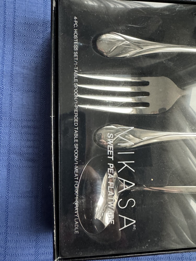 This auction is for a 4 Piece Hostess Serving Set in the Sweet Pea pattern by Mikasa Stainless. The auction includes 1 Serving Spoon, 1 Pierced Serving Spoon, 1 Serving Fork, and 1 Ladle. These pieces appear to have never been removed from the packaging. The package does show some wear from storage. Please see the pictures for additional details. Please visit my other auctions for other great deals. I will gladly combine shipping for US customers on multiple purchases. Please provide zip code for quote.