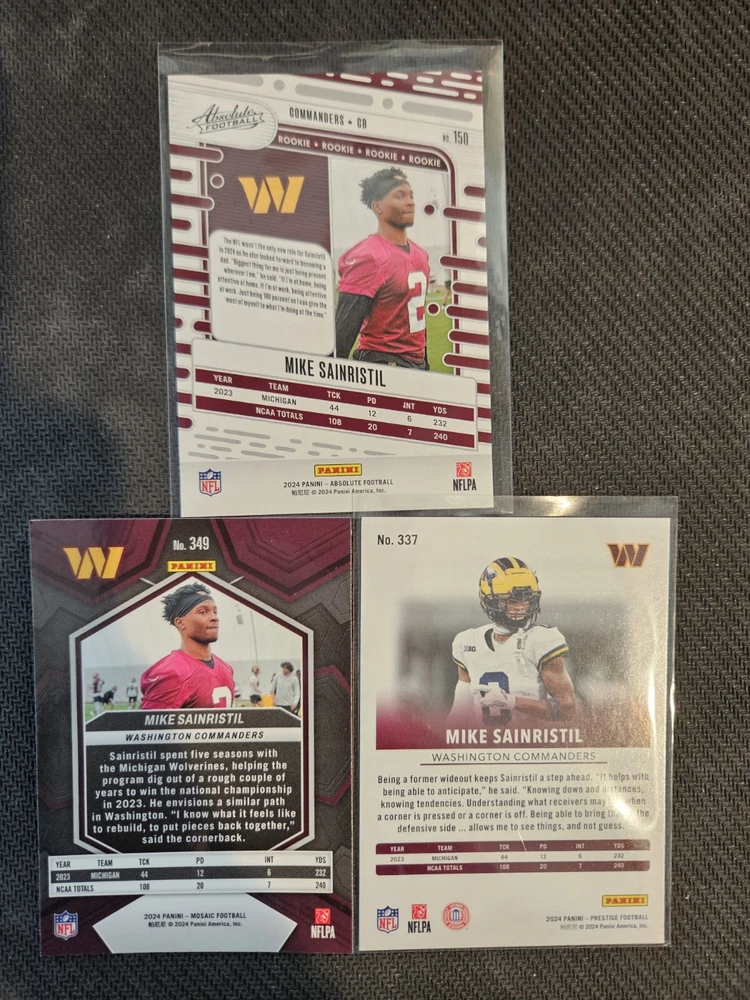 Number of Cards: 3 Season: 2024 Player/Athlete: Mike Sainristil Set: 2024 mosaic, 2024 absolute, 2024 prestige Team: Washington Commanders Type: Sports Trading Card Sport: Football League: National Football League (NFL) Year Manufactured: 2024 Manufacturer: Panini Features: Rookie