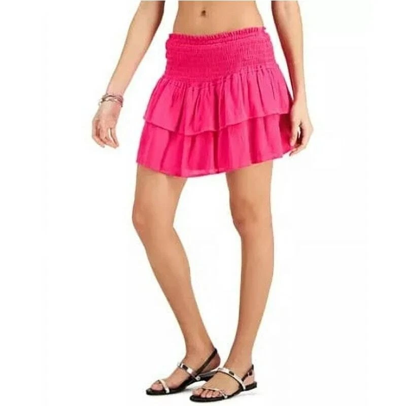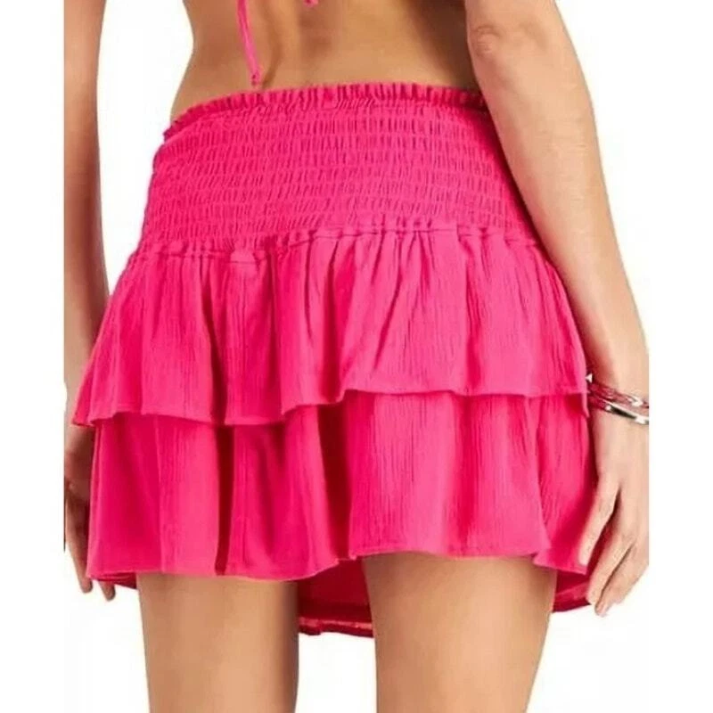 Miken Women Hot Pink Rayon Smocked Ruffled Mini Skirt Tiered Cover-Up Size L New with tags Pullover styling Smocked elastic waistband Tiered ruffled skirt Lined 79% rayon / 21% polyester Machine washable Length 15"